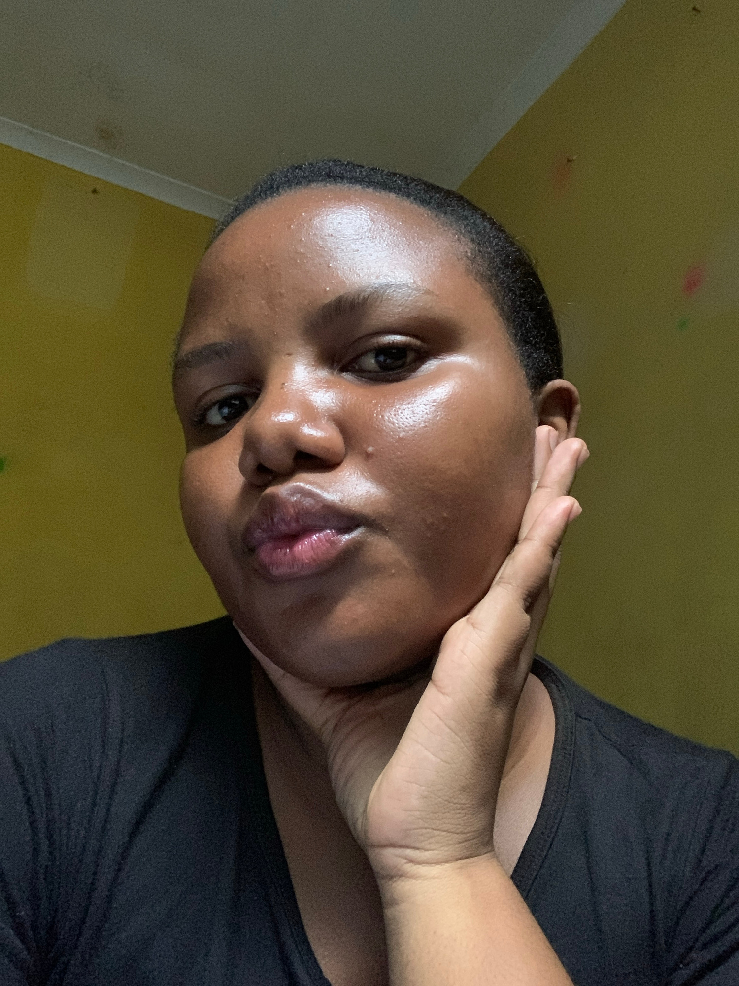 A close-up, angled shot of a woman with dark skin, possibly indoors. She's wearing a black top. Her left hand is touching her face, near her ear and cheek. The background is a pale yellow wall. Given…read more