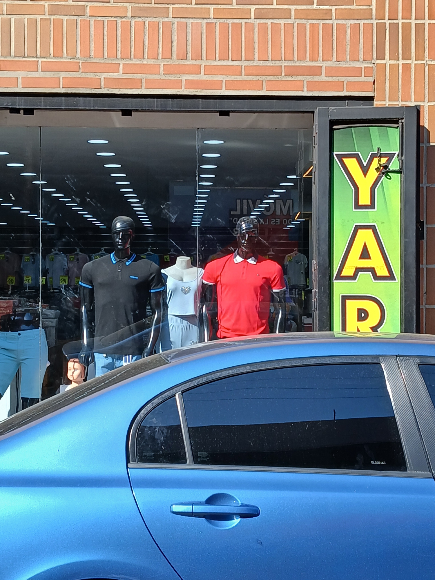 The image shows the exterior of a retail store. A portion of a blue car is visible in the foreground, reflecting the store in its windows. The store has a glass storefront, showcasing mannequins dress…read more