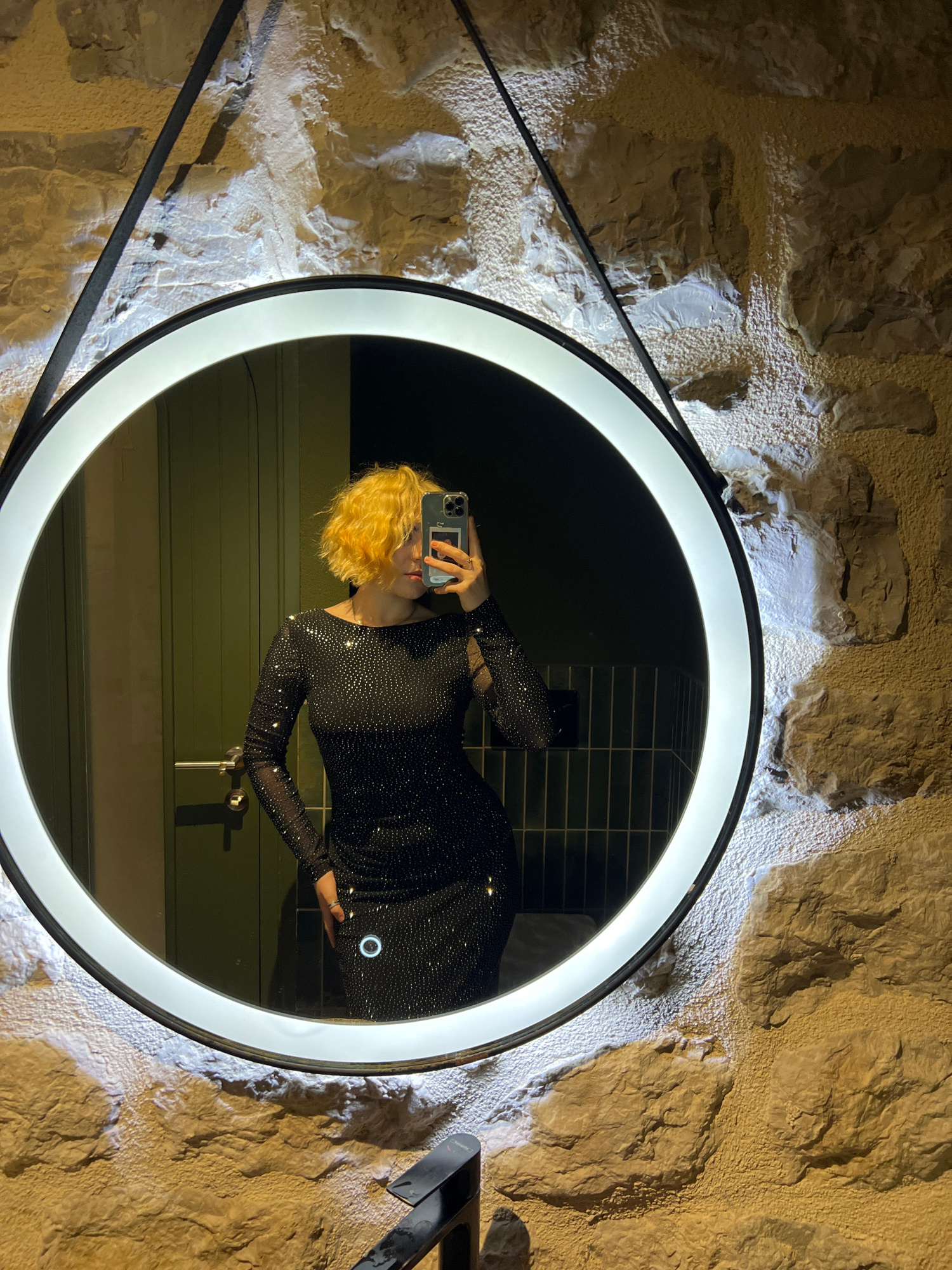 A photograph shows a woman in a black sequined dress taking a selfie in a round, illuminated mirror. The mirror is mounted on a wall constructed of rough, light-colored stone. A metal frame supports t…read more