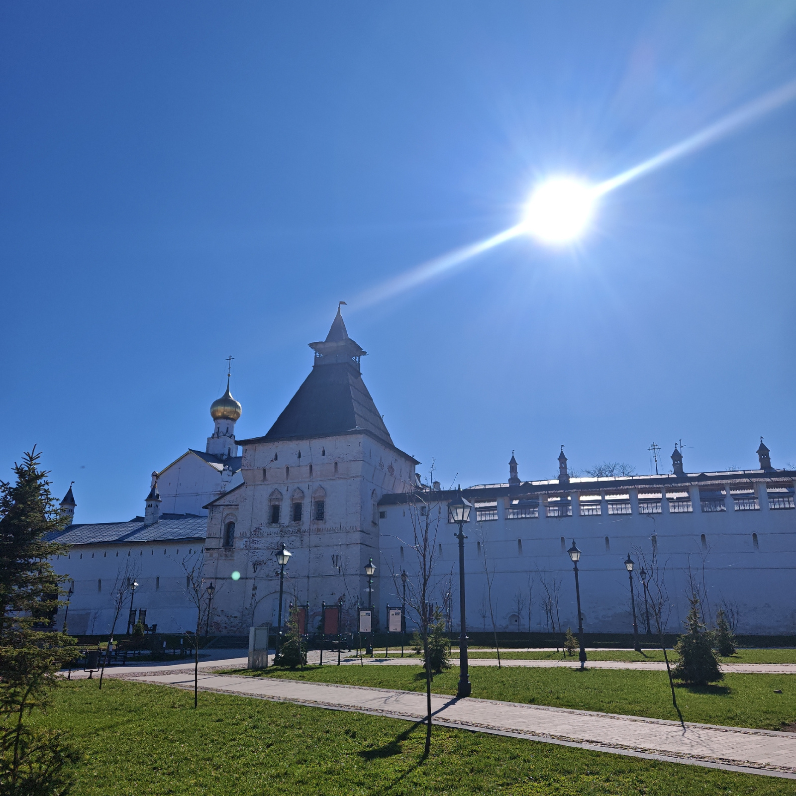The image presents a striking view of a historic architectural complex, likely a monastery or Kremlin, under a brilliant, clear blue sky. The scene is dominated by impressive white-washed walls and st…read more