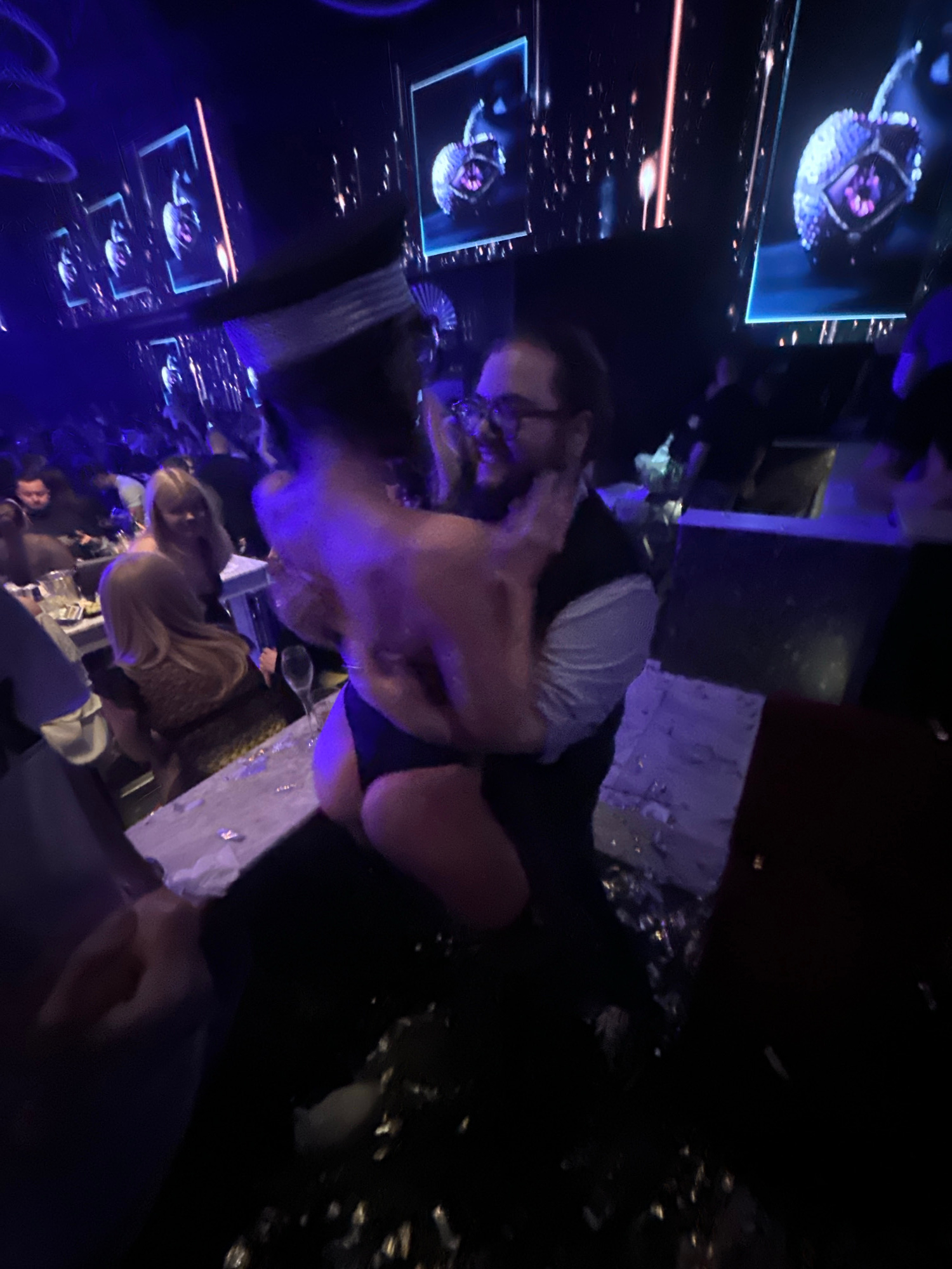 Here is a description of the image: The image captures an indoor scene with a focus on a group of people, possibly in a nightclub or a similar venue. The atmosphere is dark, with prominent blue and p…read more