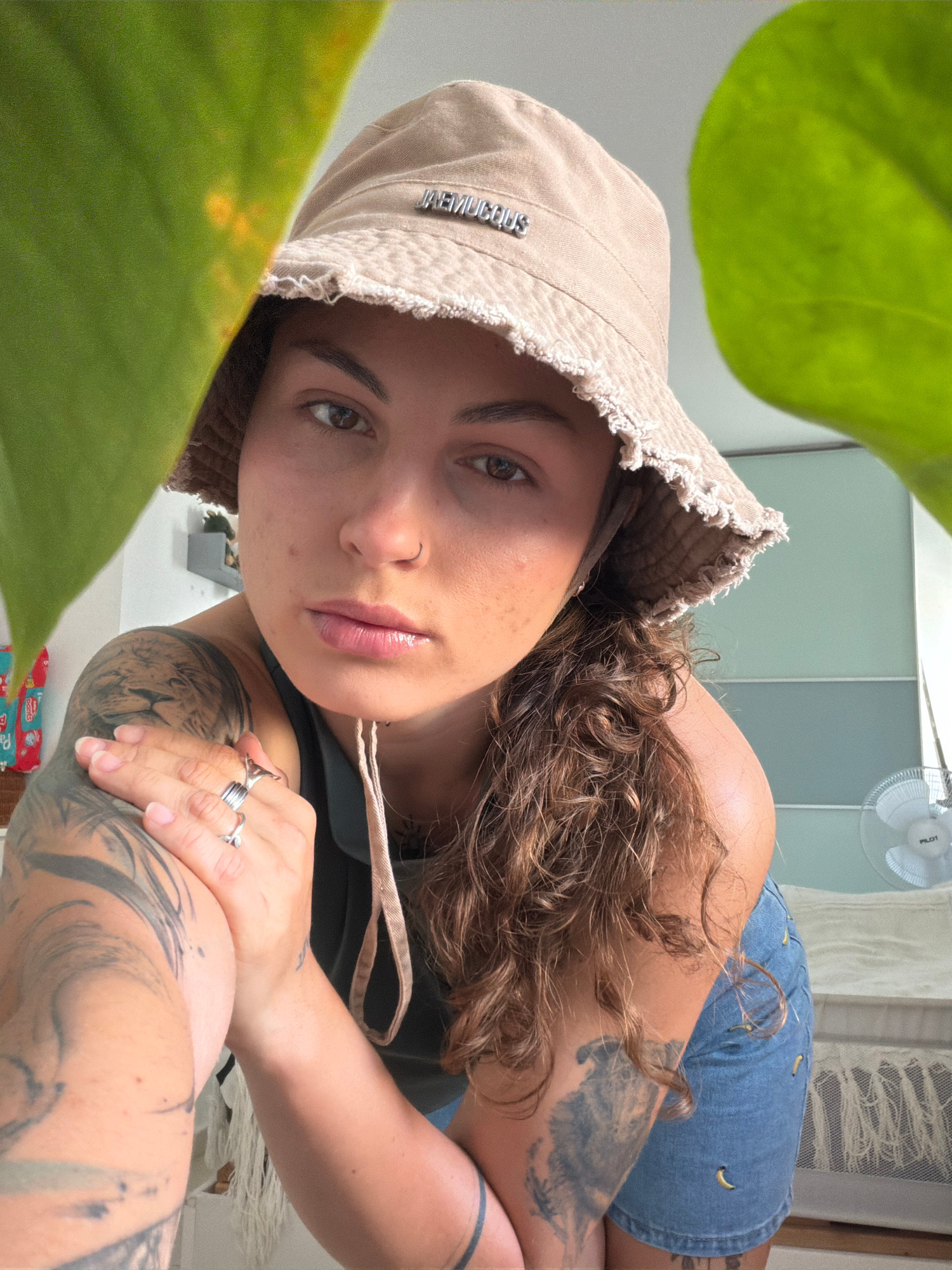 A young adult female is the subject, wearing a beige bucket hat and denim shorts with small banana designs. She has curly brown hair and multiple tattoos on her arms. She is also wearing several rings…read more