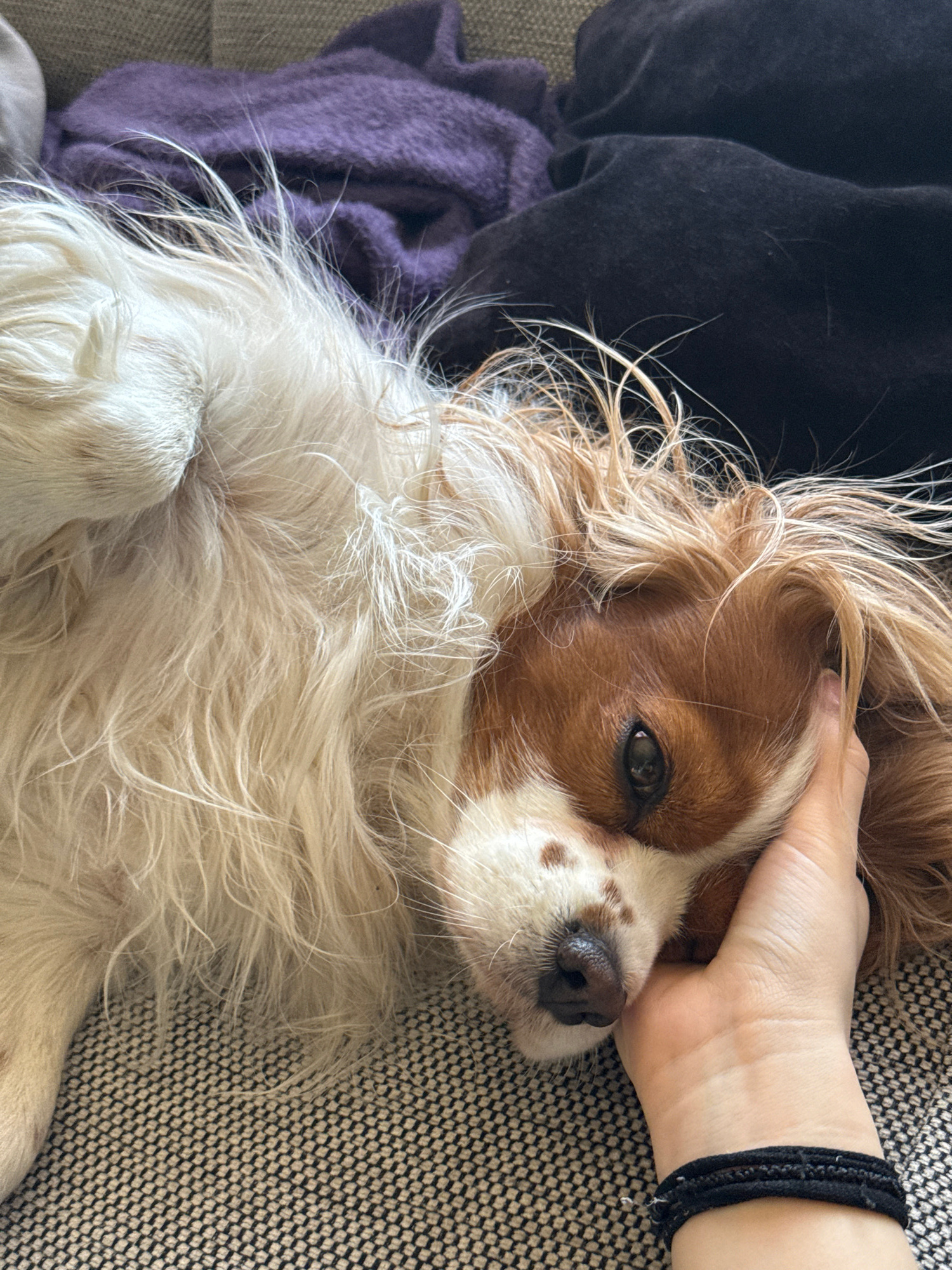 A medium shot captures a Cavalier King Charles Spaniel lying on a patterned grey fabric, possibly a couch or bed, with a hand gently resting on its head. The dog is facing towards the viewer, with its…read more
