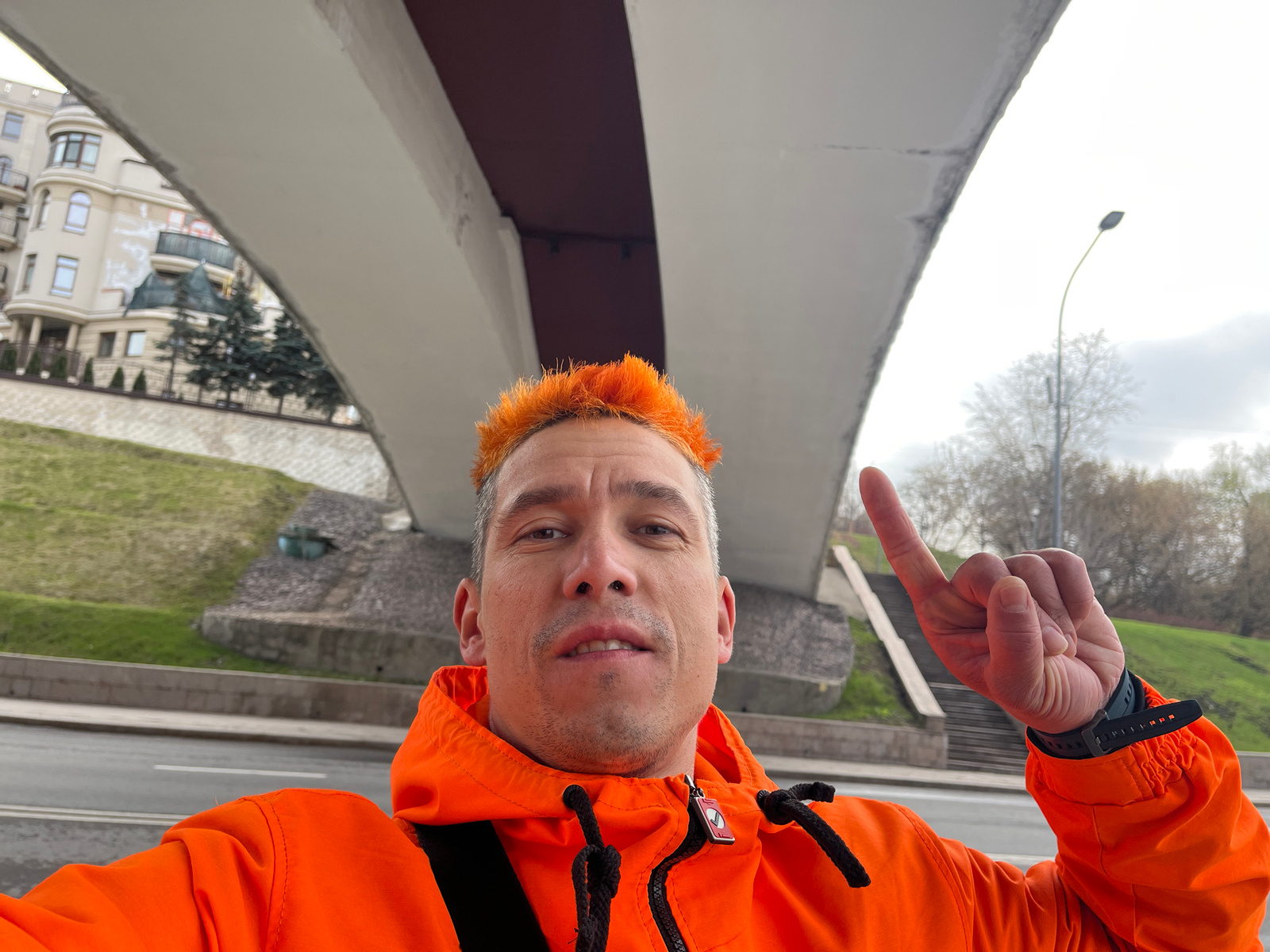 A person in an orange jacket, facing downward in the frame, is pointing towards a tall, white and brown structure. The structure appears to be a modern architectural element, possibly part of a bridge…read more