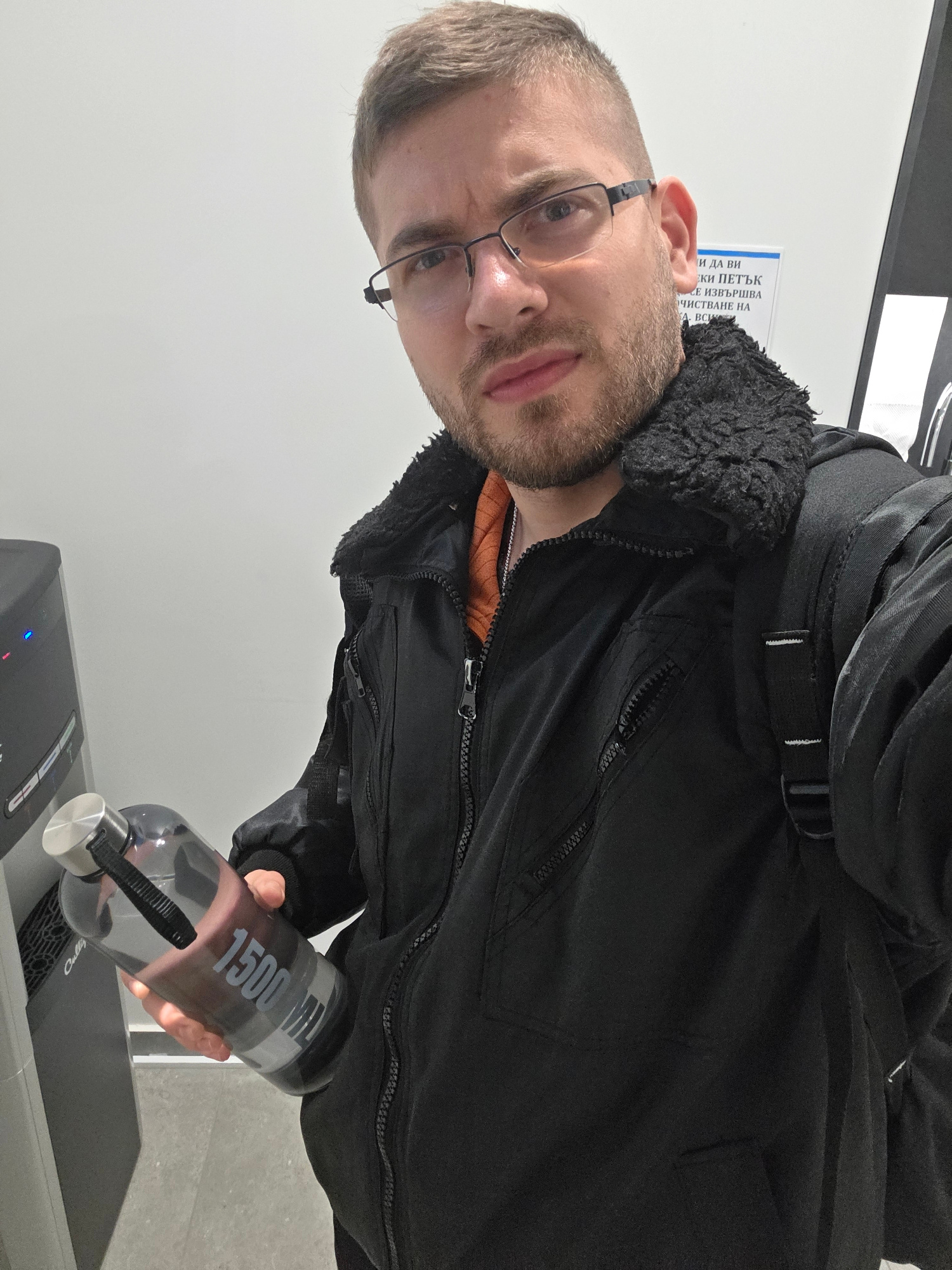 A man with glasses, a beard, and wearing a black jacket with a fur collar and a backpack stands indoors in Plovdiv, Bulgaria. He is filling a 1500ml water bottle at a water dispenser. A sign with Bulg…read more