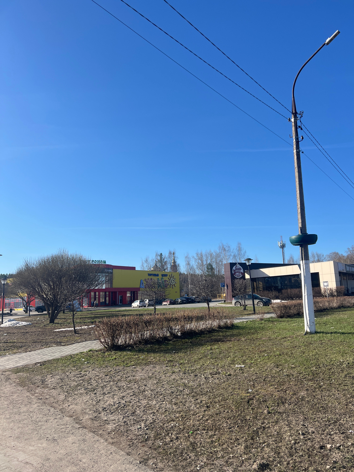 The image depicts a street scene in what appears to be the city of Chaikovsky, Russia, during daylight hours under a clear, blue sky. A concrete utility pole with power lines and a streetlight is visible on the left side of the frame. A green traffic indicator is mounted on the pole. Parallel to the street, on the right, is a strip of land with grass and sparse vegetation, bordered by a sidewalk. Buildings and commercial establishments line the street, including a "Vkusno - i Tochka" fast food restaurant and a shopping center. Several parked vehicles can be seen along the roadside. The foreground shows an unpaved pathway leading along the strip of grass. | Open Wire