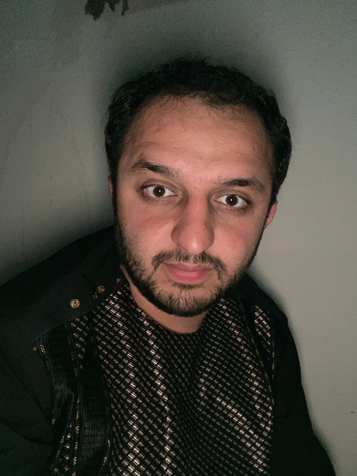 A man with dark hair and a beard is wearing a black and silver patterned shirt with gold buttons. He is looking directly at the camera with a neutral expression. His skin has a slightly ruddy complexi…read more