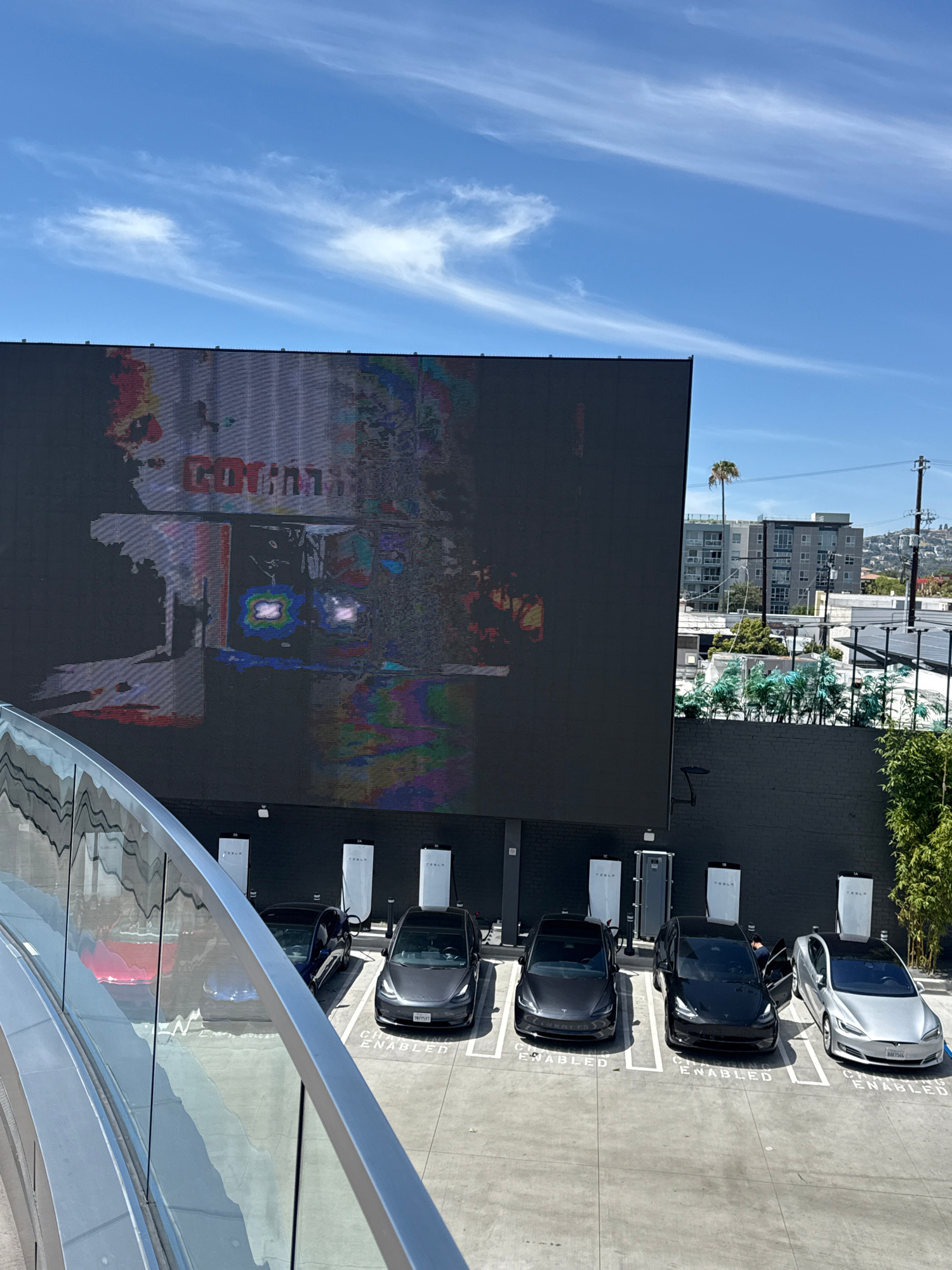 Captured from a high-angle perspective in West Hollywood, United States of America, the image displays a scene with a prominent outdoor digital display dominating the left side of the frame. The scree…read more