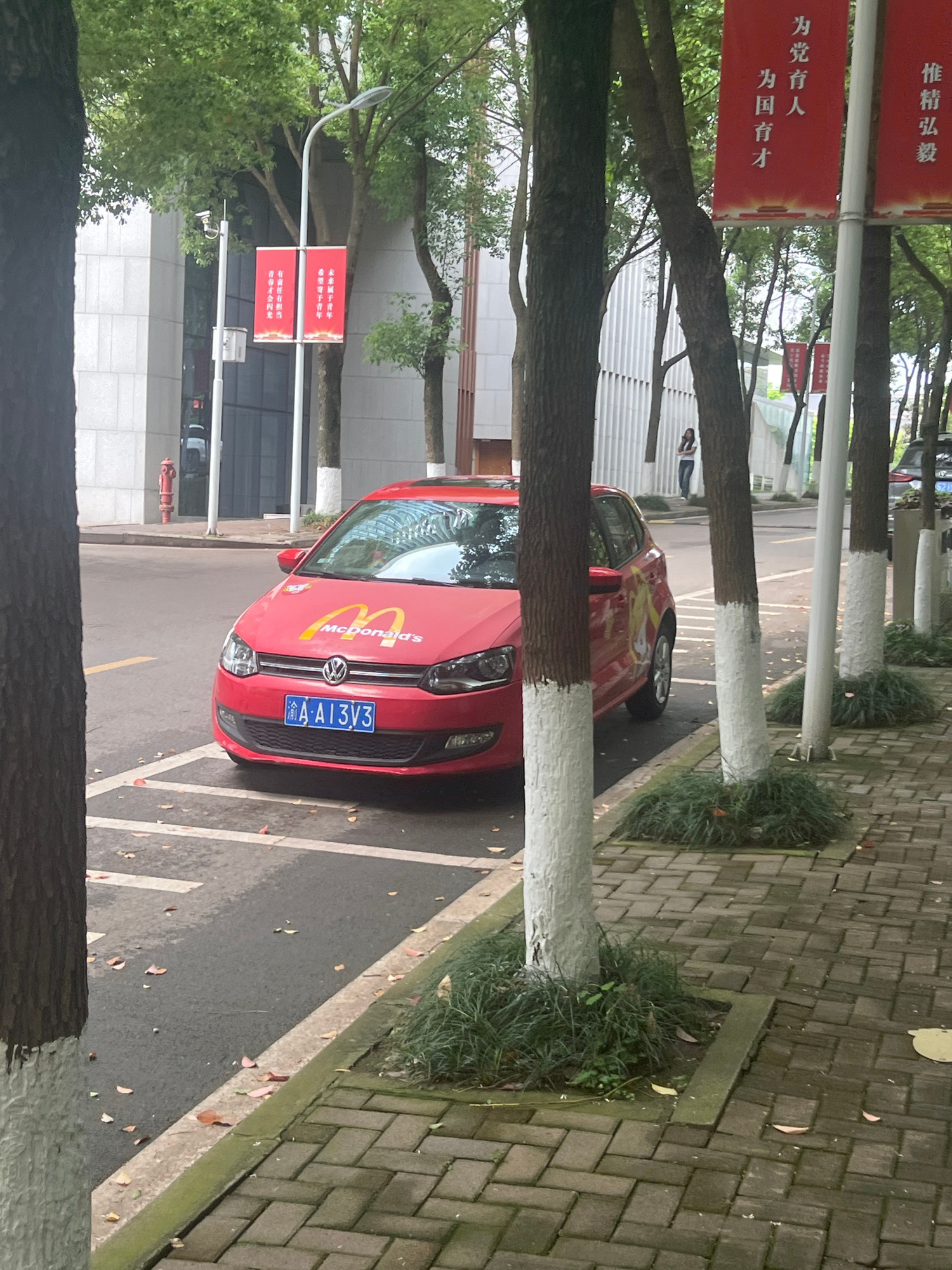 The image shows a red car with a McDonald's logo on the hood, parked in a parking space. The car's license plate reads "渝A-A13V3". The car is parked near a sidewalk paved with interlocking bricks. On…read more