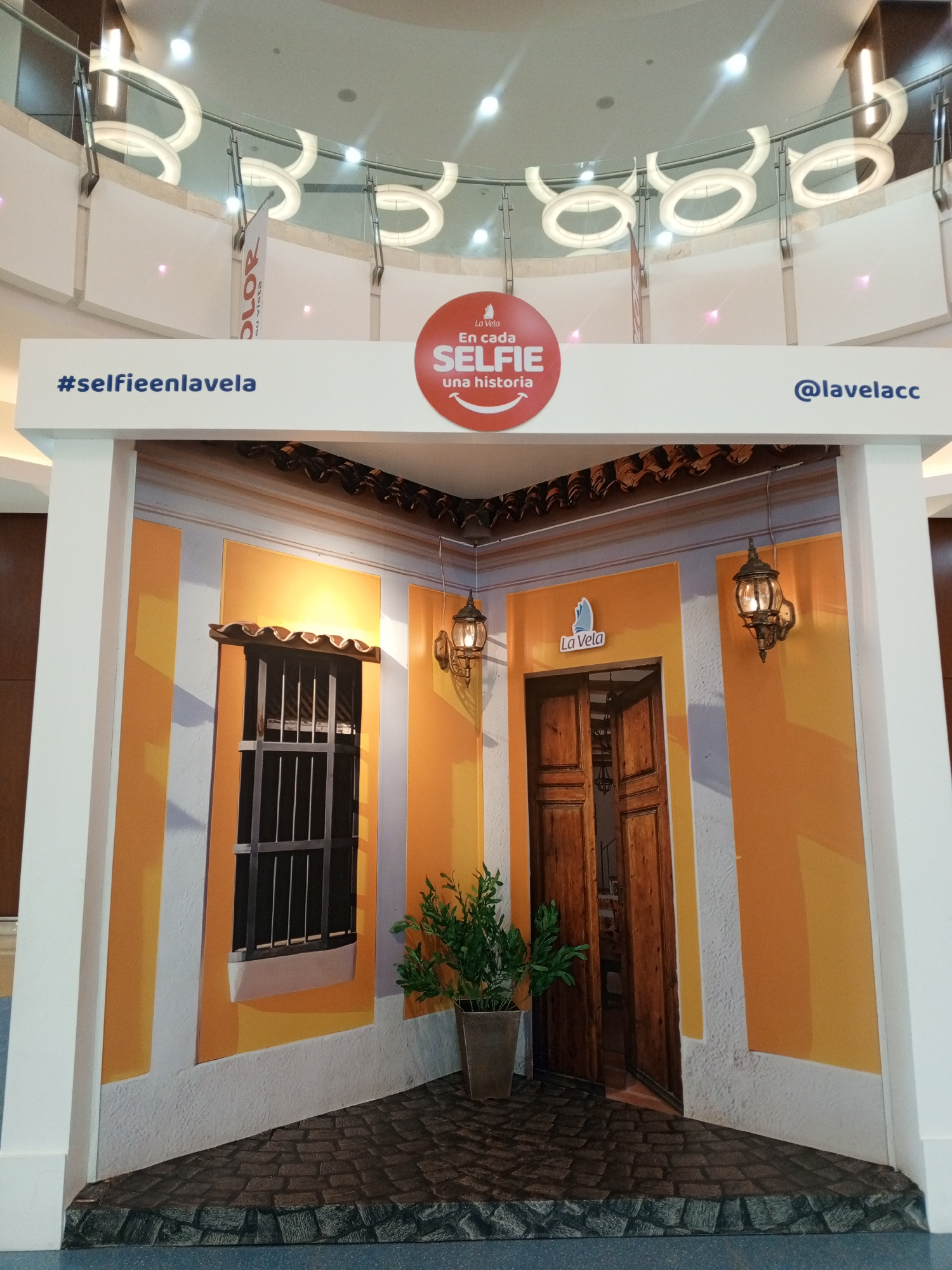 Here is a detailed description of the image: **Scene Overview:** The image showcases a selfie station set up in what appears to be a shopping mall. The station features a backdrop that mimics the fa…read more
