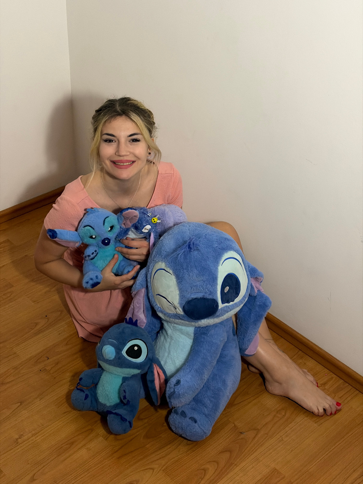 This image, taken indoors in Budva, Montenegro, features a young woman surrounded by several plush toys. The scene is set against a light, off-white wall and a light brown wooden floor, suggesting a c…read more