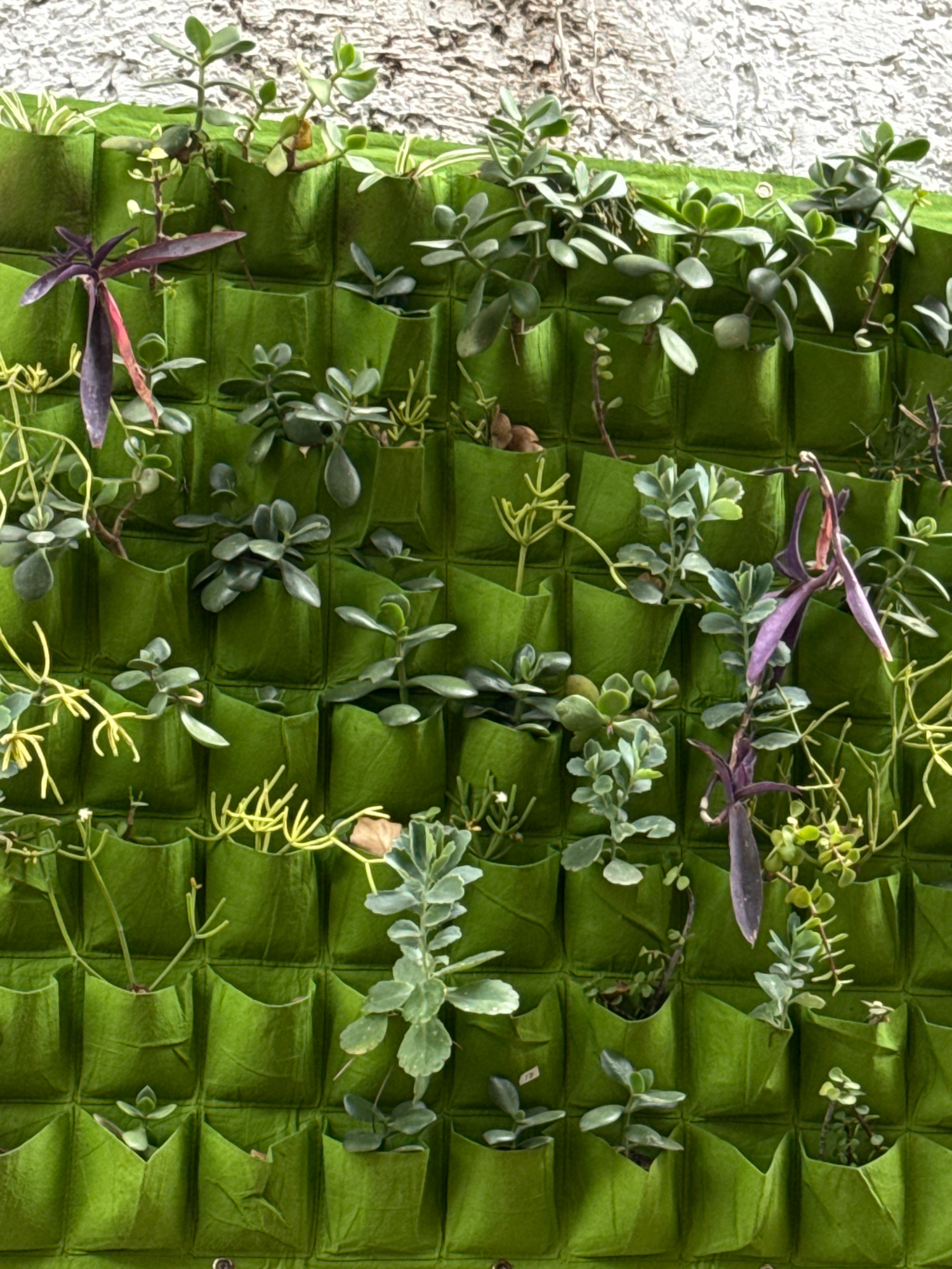 The image depicts a vertical garden attached to a textured white wall. The garden is composed of a green, pocketed material with several plants growing from the pockets. Some of the plants have gray-g…read more