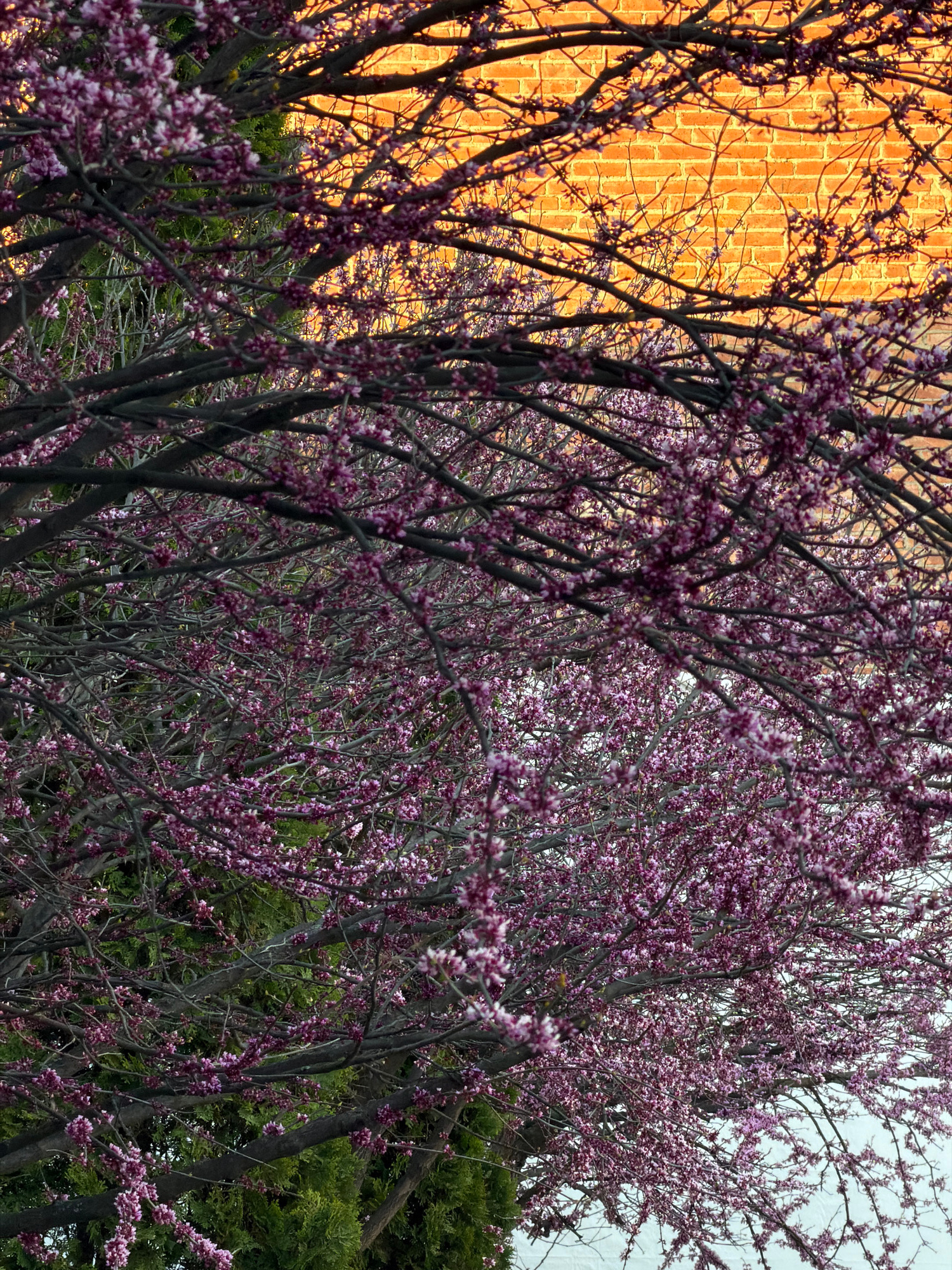 The image presents a vibrant springtime scene in Armavir, Russia, dominated by several trees in full bloom. The central and right portions of the frame are filled with a dense array of dark, intricate…read more