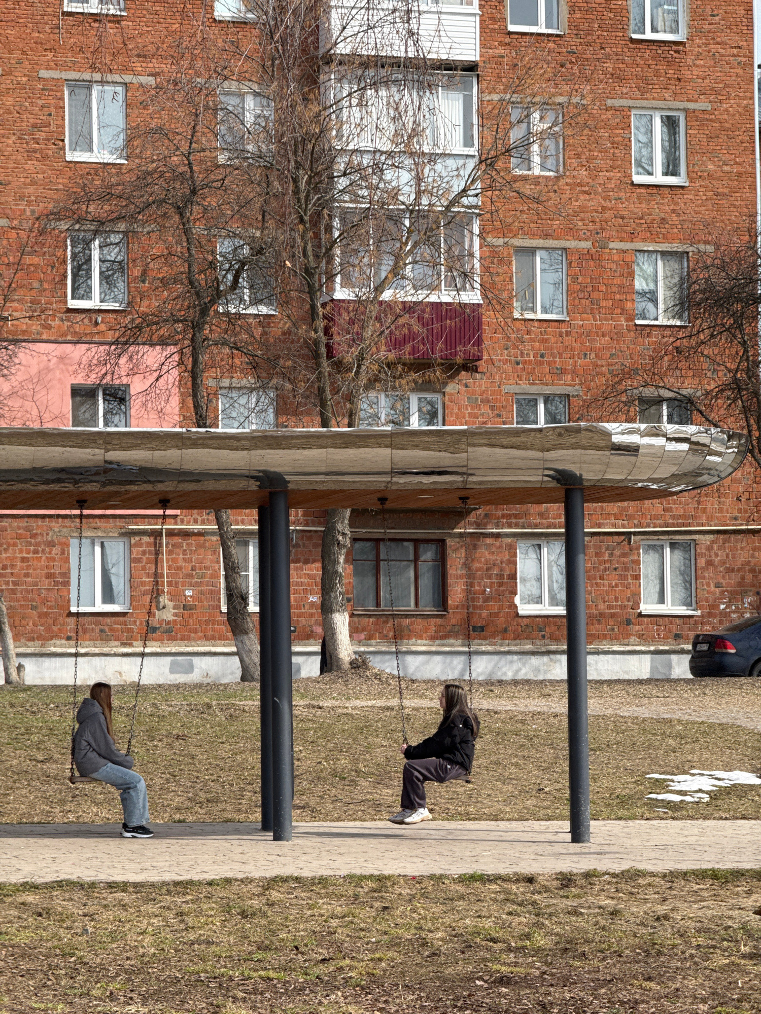 The image depicts an outdoor scene with a brick building and a playground. Two individuals are on swings: one wearing a black jacket and pants, the other wearing a gray jacket and blue jeans. A blackβ¦read more