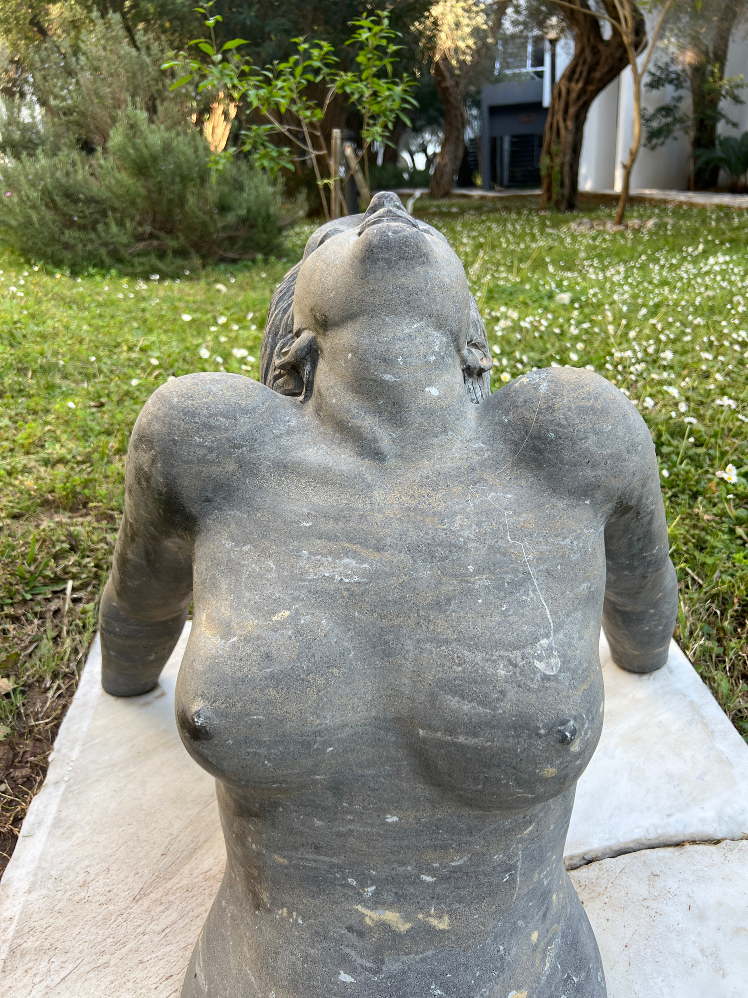 The image depicts a weathered, gray stone statue of a nude woman, likely an art installation or sculpture, set outdoors. The statue is positioned on a white, possibly marble, platform or base. The bac…read more