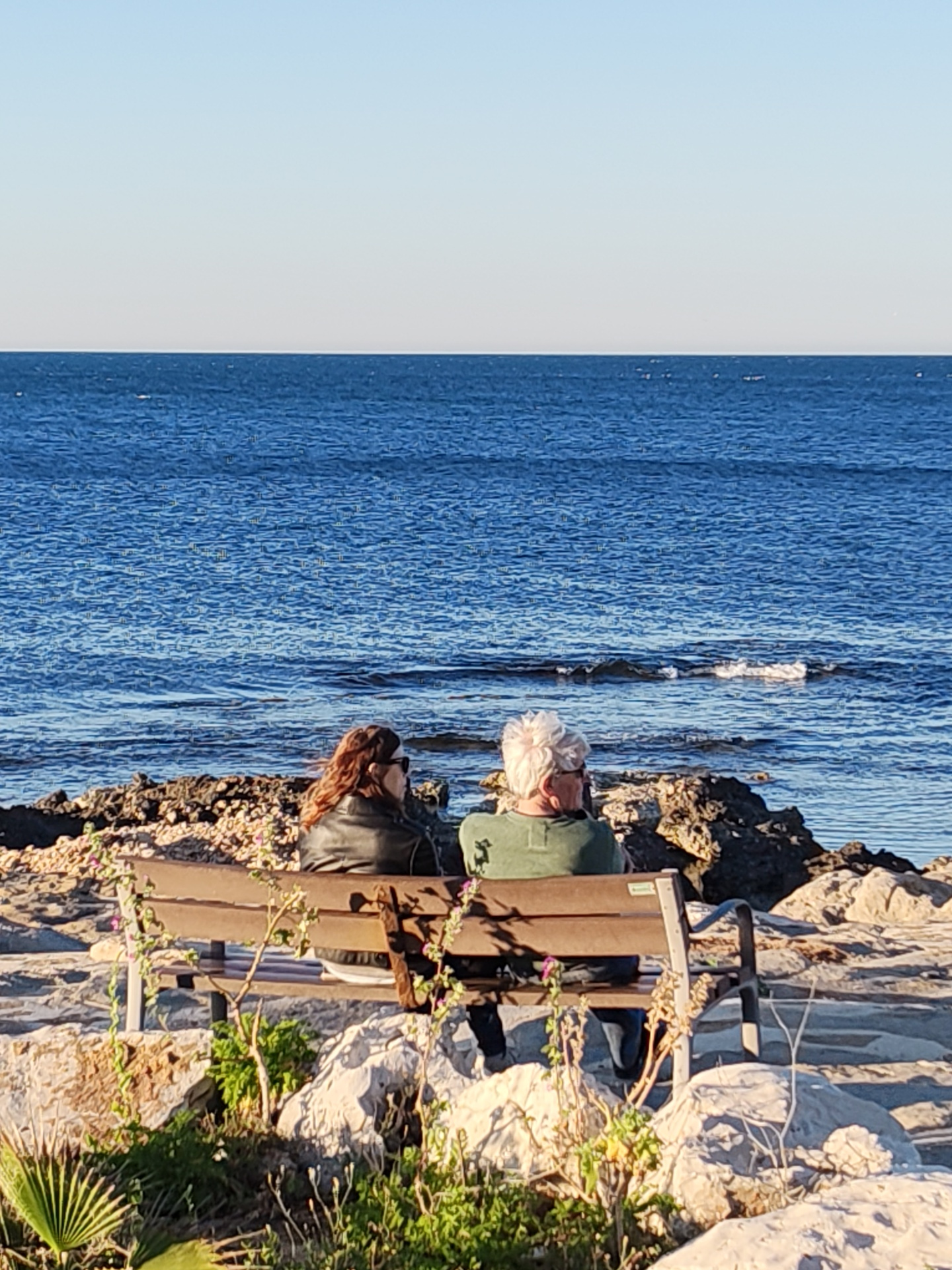 The image displays a serene coastal scene at Rotes, Spain, featuring two people seated on a wooden park bench, observing the sea. Both individuals have their backs to the viewer. The person on the lef…read more