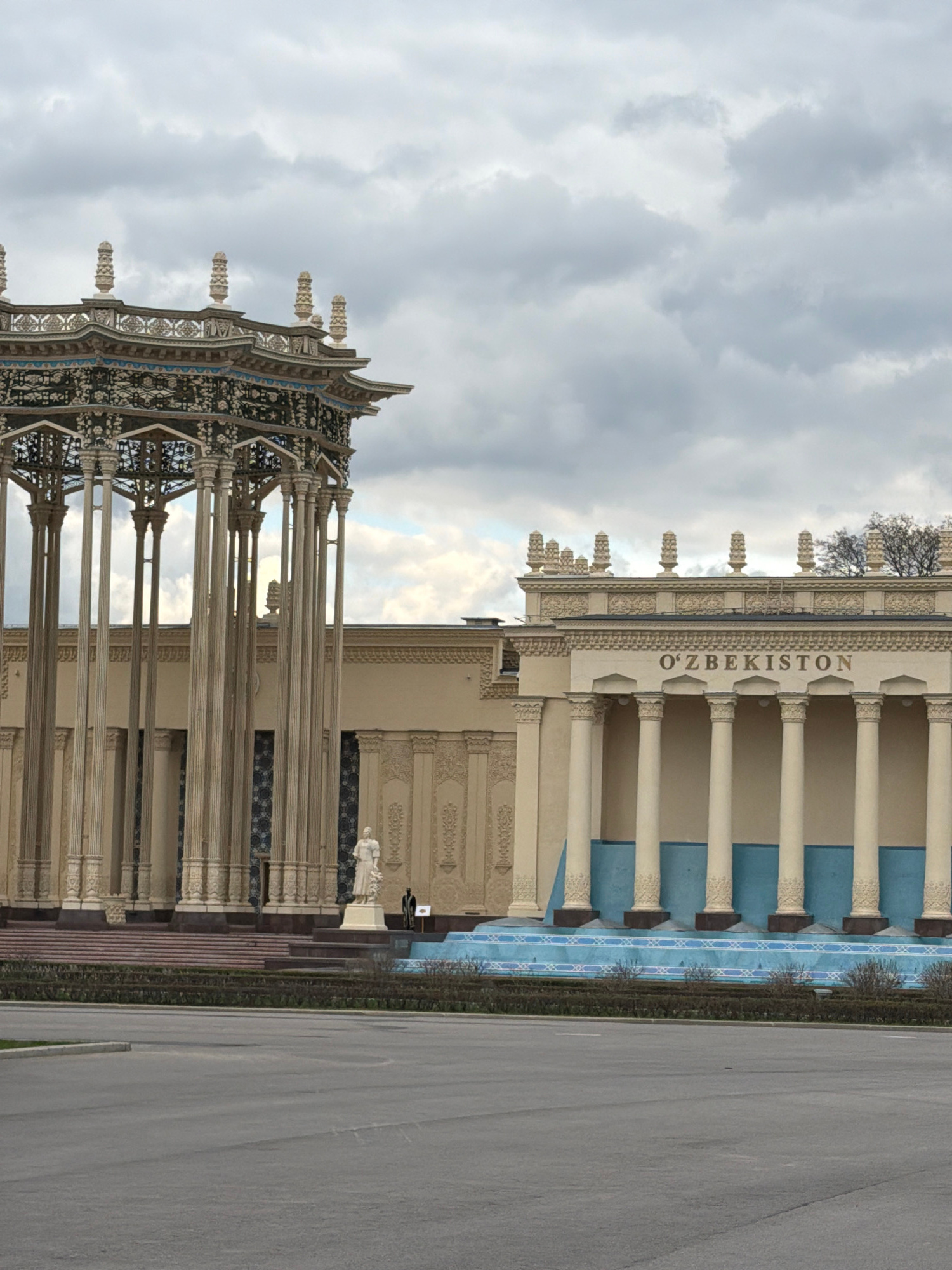 This media file captures a grand architectural complex, likely an exhibition pavilion, under an overcast sky. The scene is dominated by two ornate structures and an expansive paved area. On the right…read more