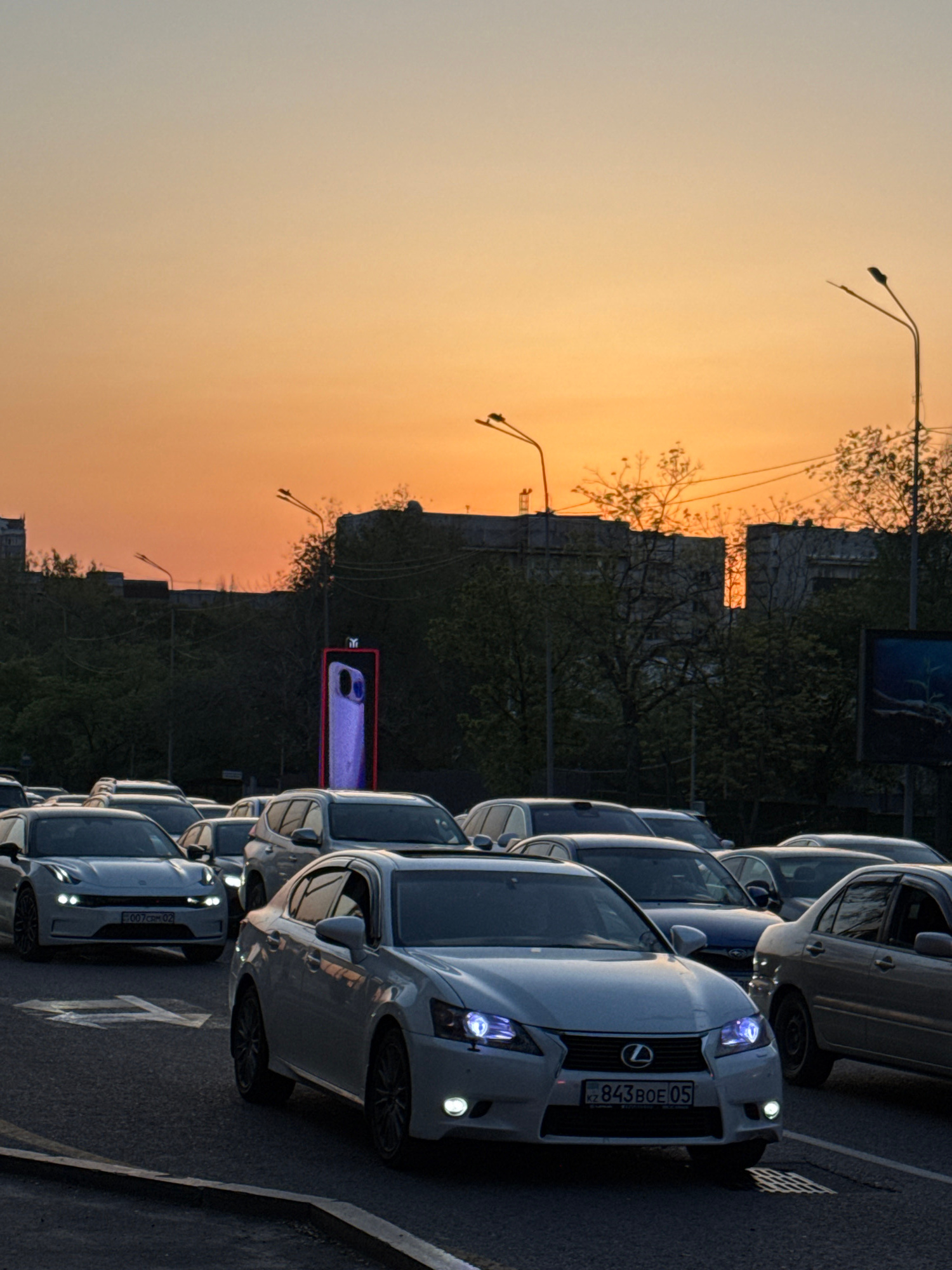 This media file captures an urban street scene at either sunrise or sunset, characterized by a warm, orange, and yellow gradient sky dominating the upper and left portions of the frame. A line of cars…read more