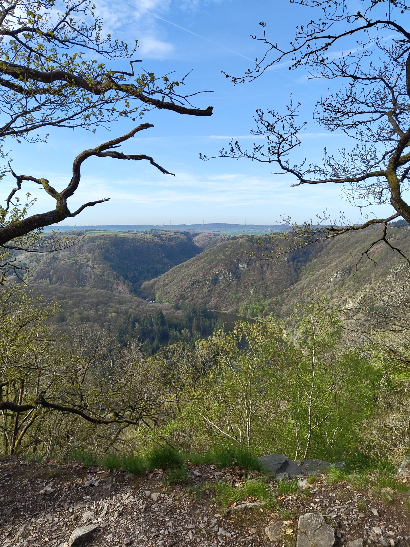 The image depicts a view from a high vantage point within the city of Mettlach, Germany. The foreground showcases a rocky path with sparse grass and trees with budding leaves. In the distance, a deep…read more