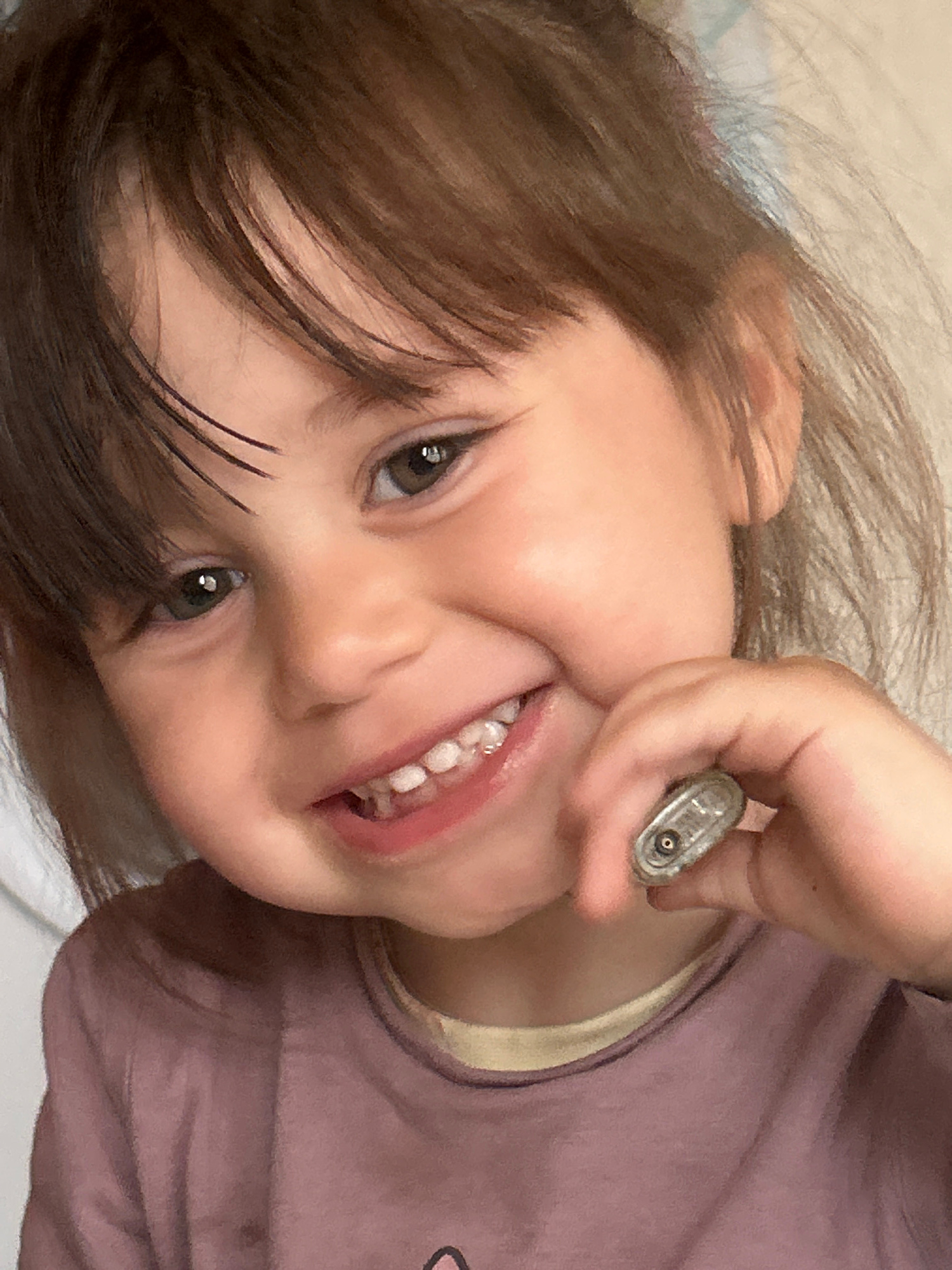 A young child with brown hair and eyes is smiling, with a hand holding a metallic object (likely a lighter) near their face. The child is wearing a mauve-colored top with a beige collar. The setting i…read more