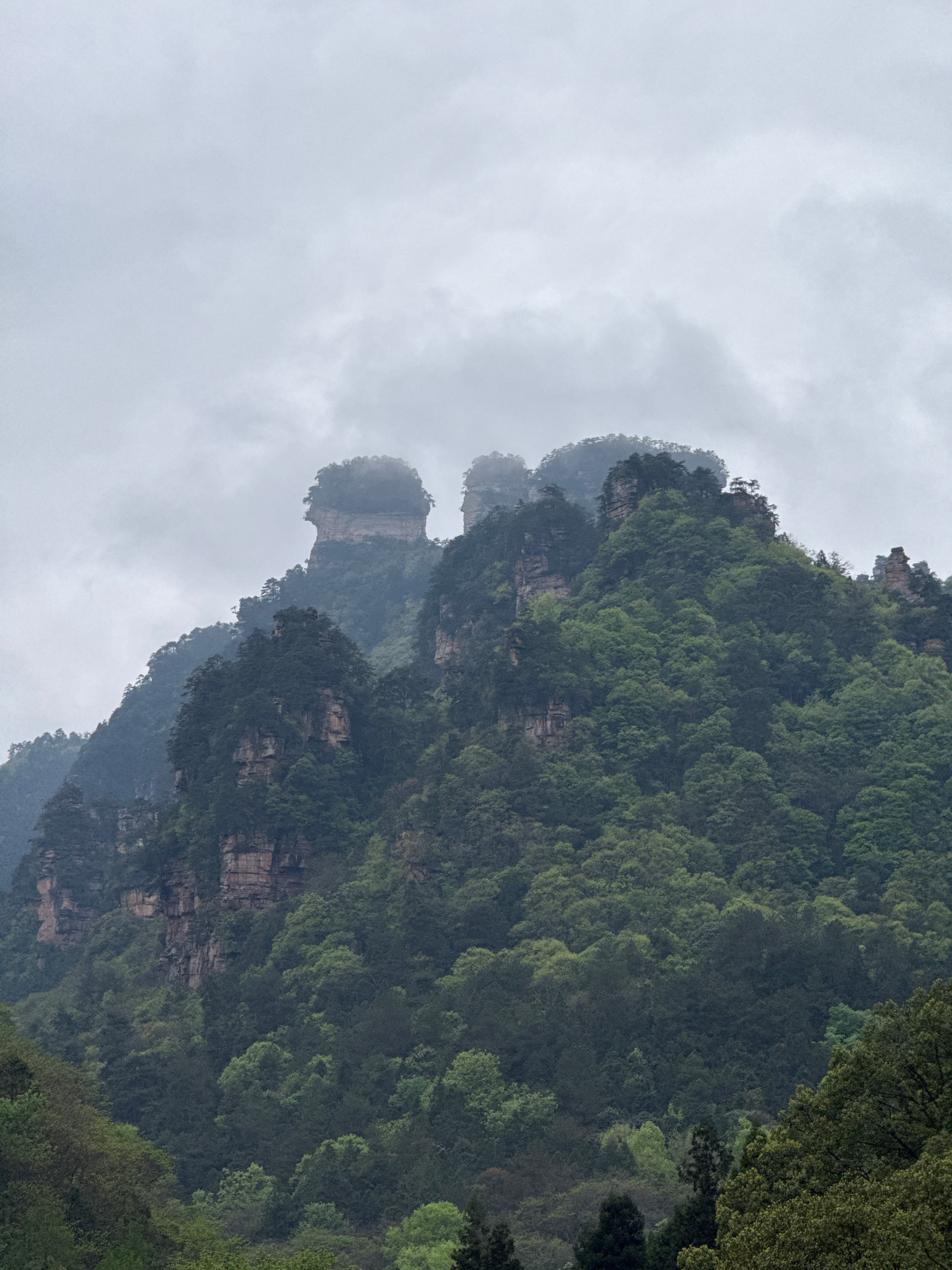 The image depicts the Zhangjiajie National Forest Park in Luoguta, China. The scene focuses on several tall, pillar-like rock formations densely covered in green vegetation. The formations fade into t…read more