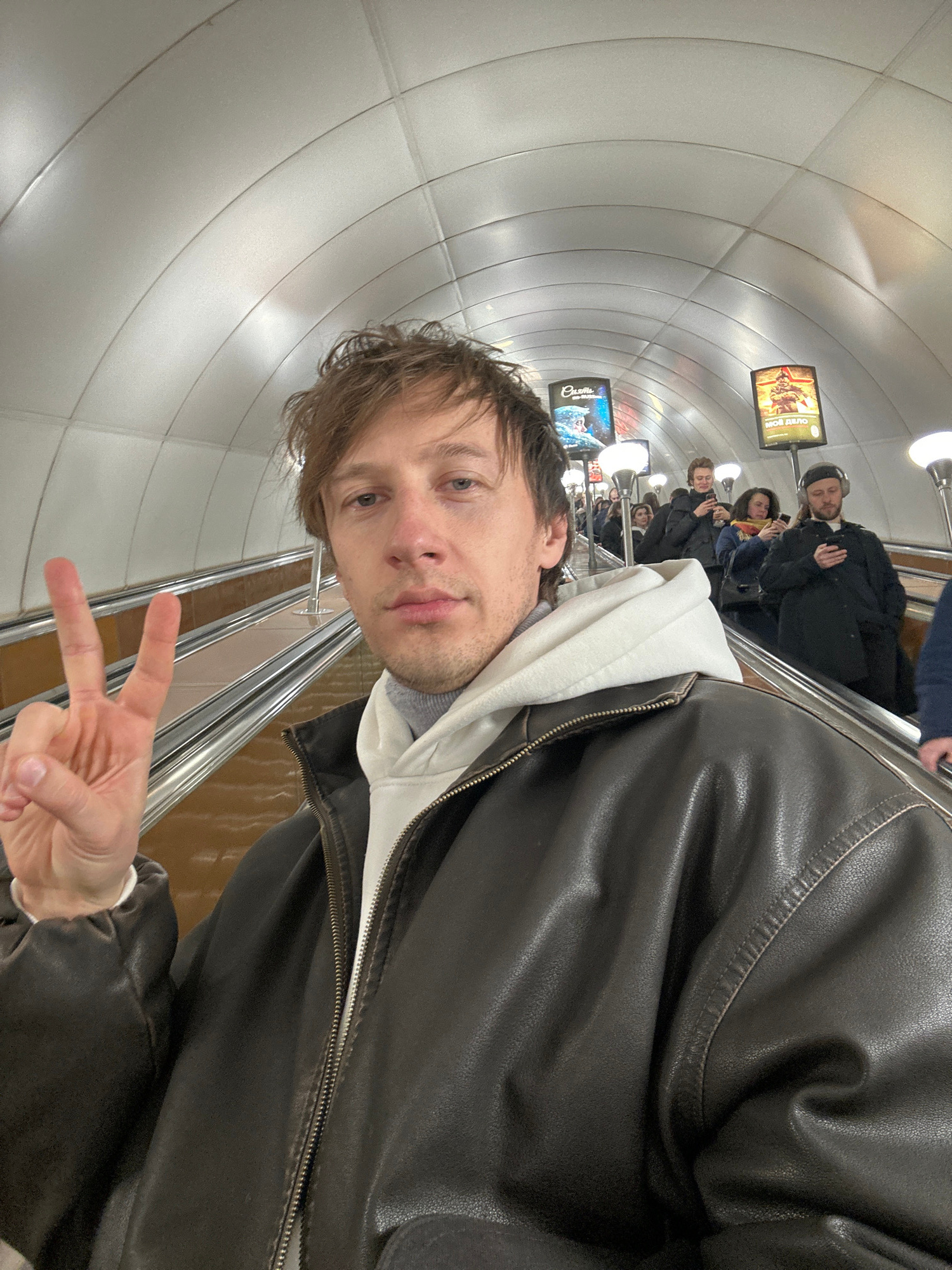 A man in a black leather jacket and white hoodie takes a selfie in a subway station in Saint Petersburg, Russia. The subway has escalators. The man is making a peace sign. A row of people, including a…read more