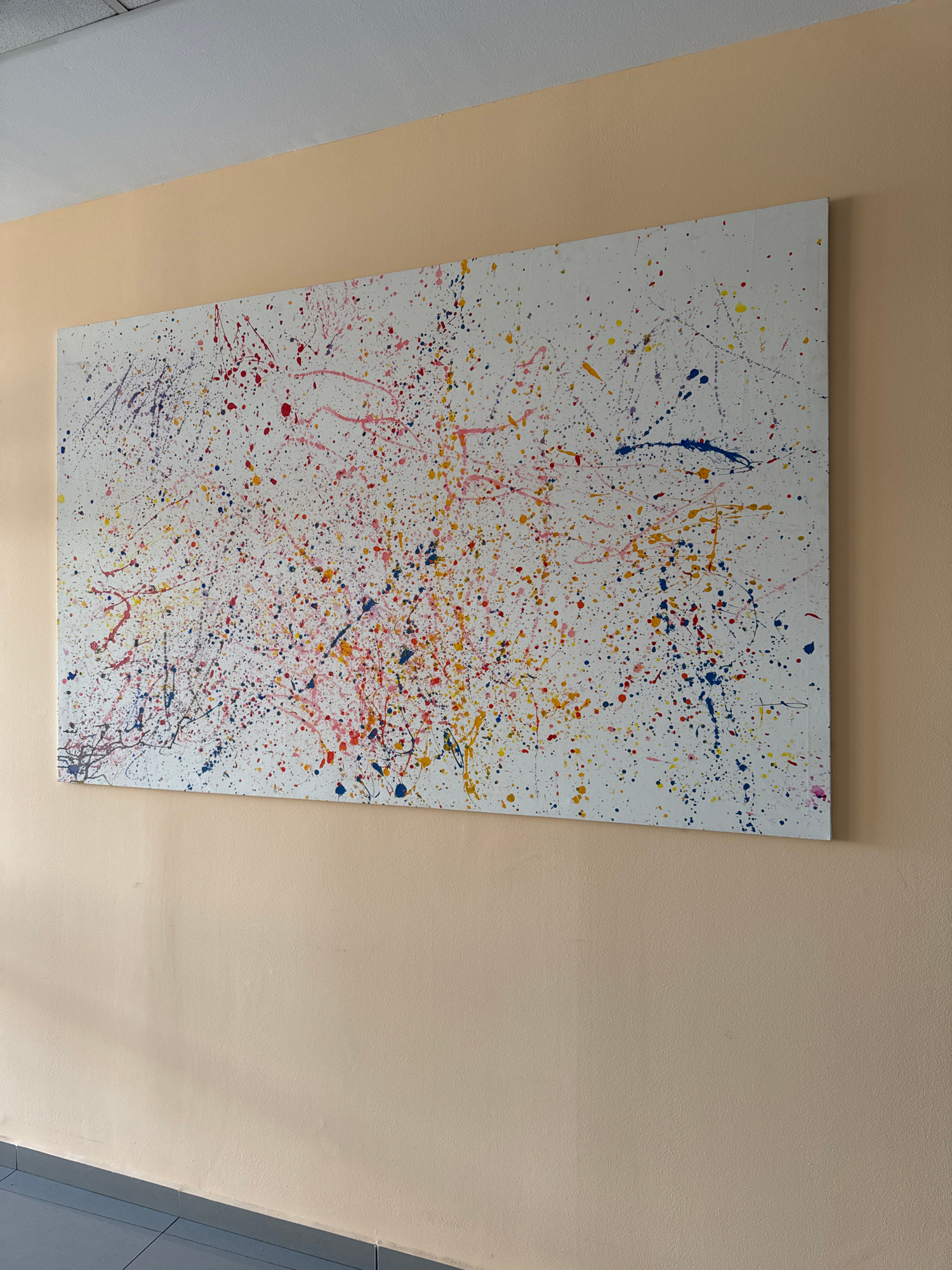 A rectangular, white canvas with multicolored paint splatters hangs on a light peach-colored wall. The painting contains blue, red, yellow, and white paint, and the splatters vary in size and distribu…read more