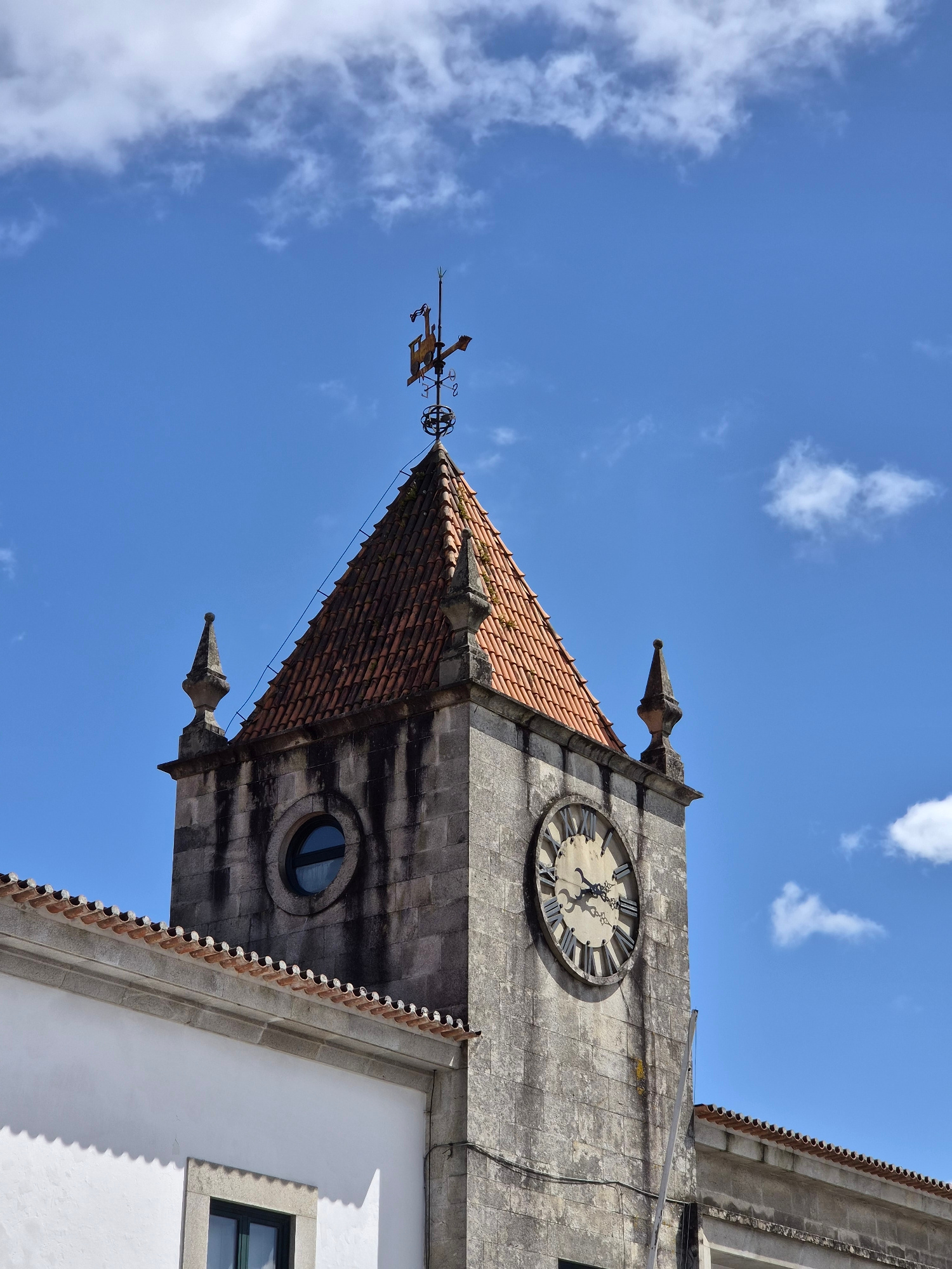 The image depicts a low-angle view of a clock tower situated in Barcelos, Portugal, against a clear blue sky with scattered clouds. The tower is constructed of grey stone and features a red-tiled pyra…read more