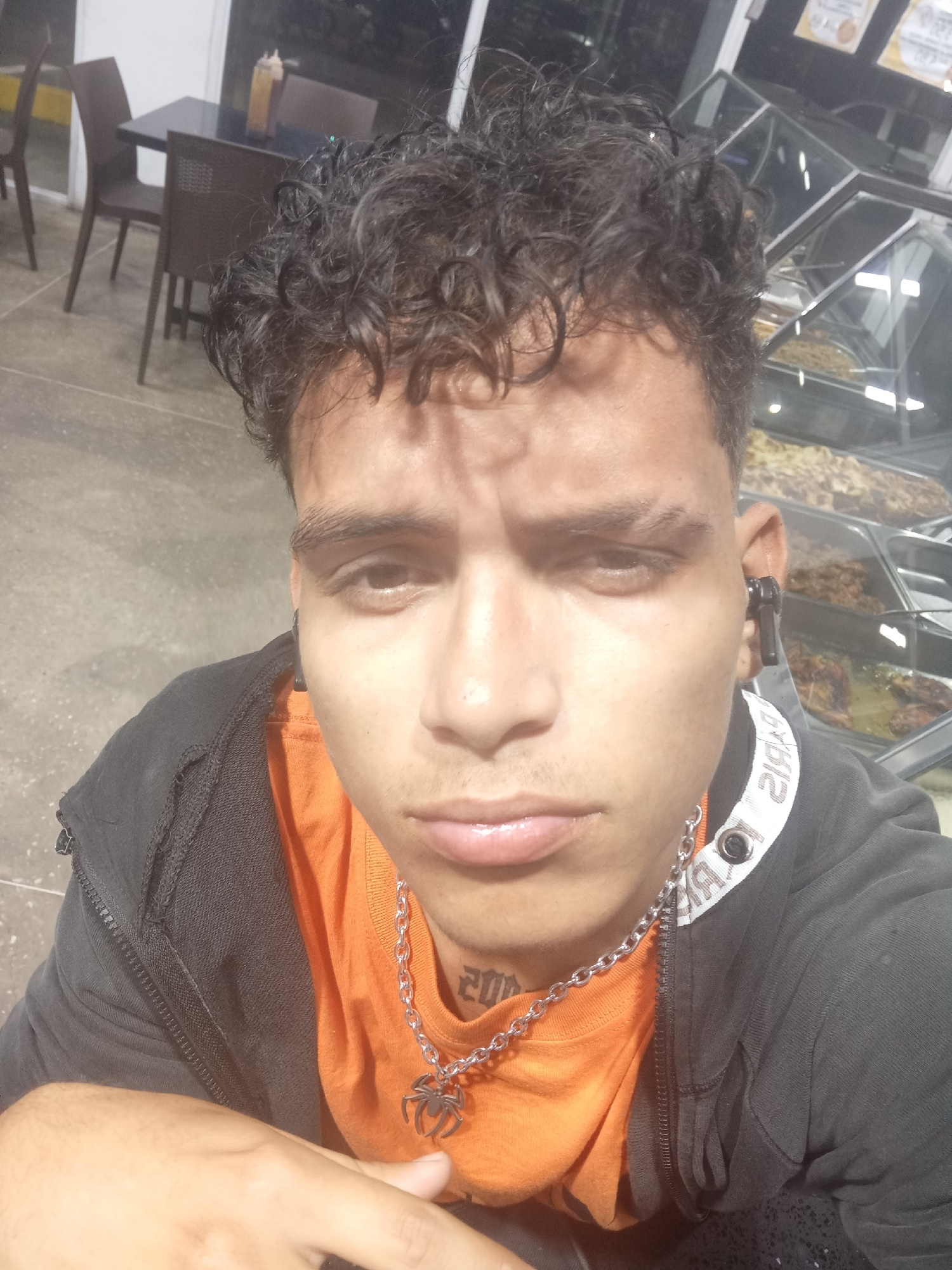 A close-up shot of a young adult male with curly hair and dark skin is shown. The male is wearing a dark hoodie over an orange t-shirt, and a silver chain with a spider pendant. The tattoo "2012" is v…read more