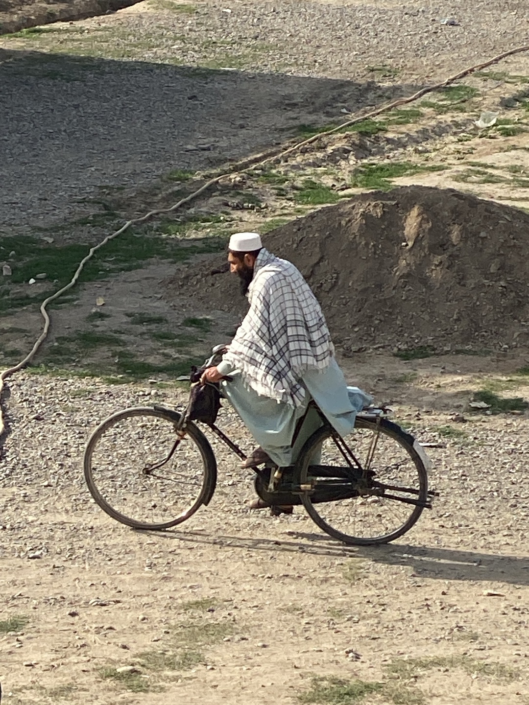 An outdoor, eye-level shot depicts a bearded man riding a bicycle on a dusty, unpaved path under bright sunlight in Kandahar, Afghanistan. The man, likely of Afghan descent, wears a white kufi cap, a…read more