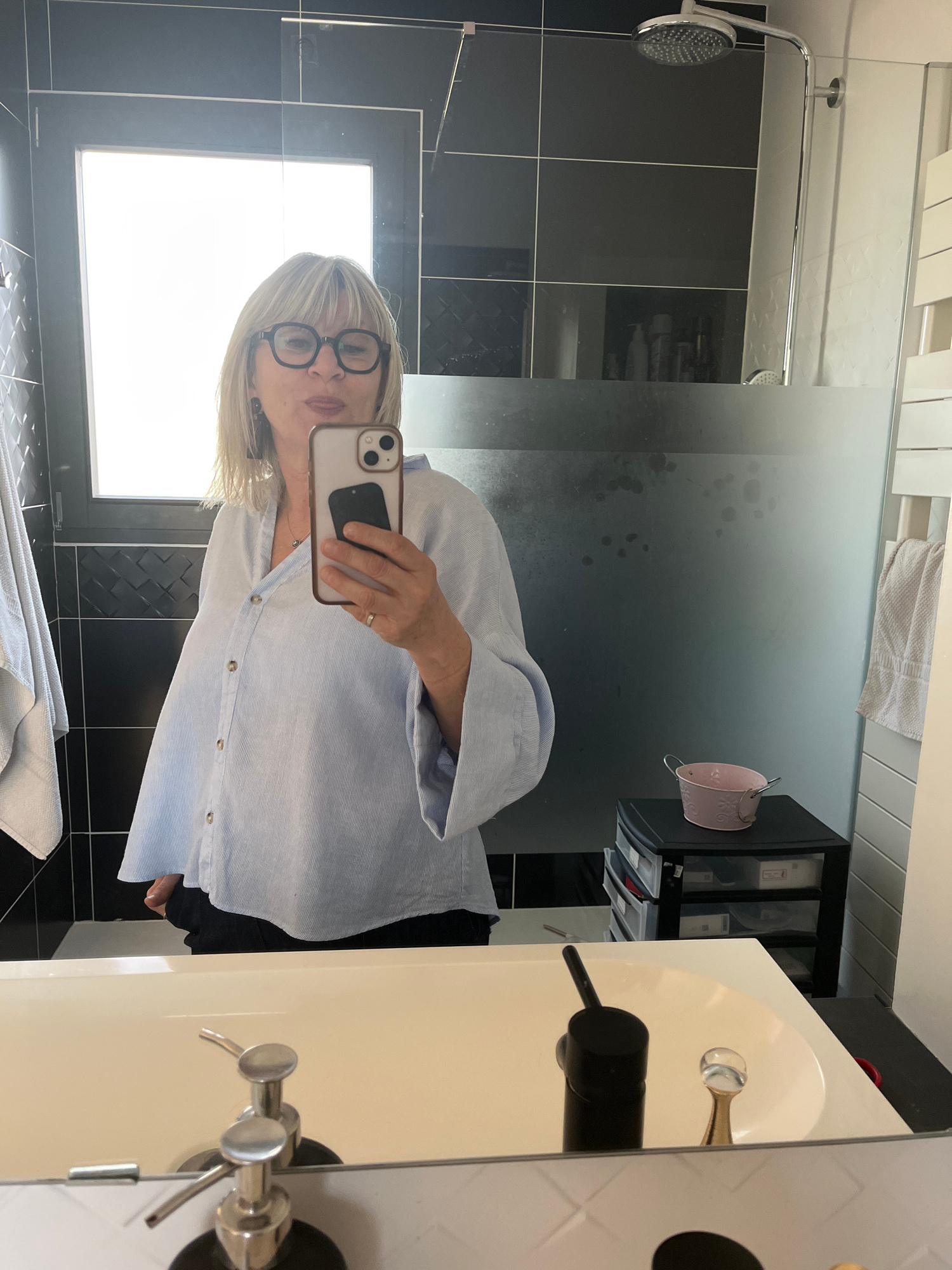 A selfie taken in a bathroom. The bathroom features black and white checkered tiles, a shower with a glass door, a towel rack with a white towel, and a white sink. A woman wearing glasses and a light…read more