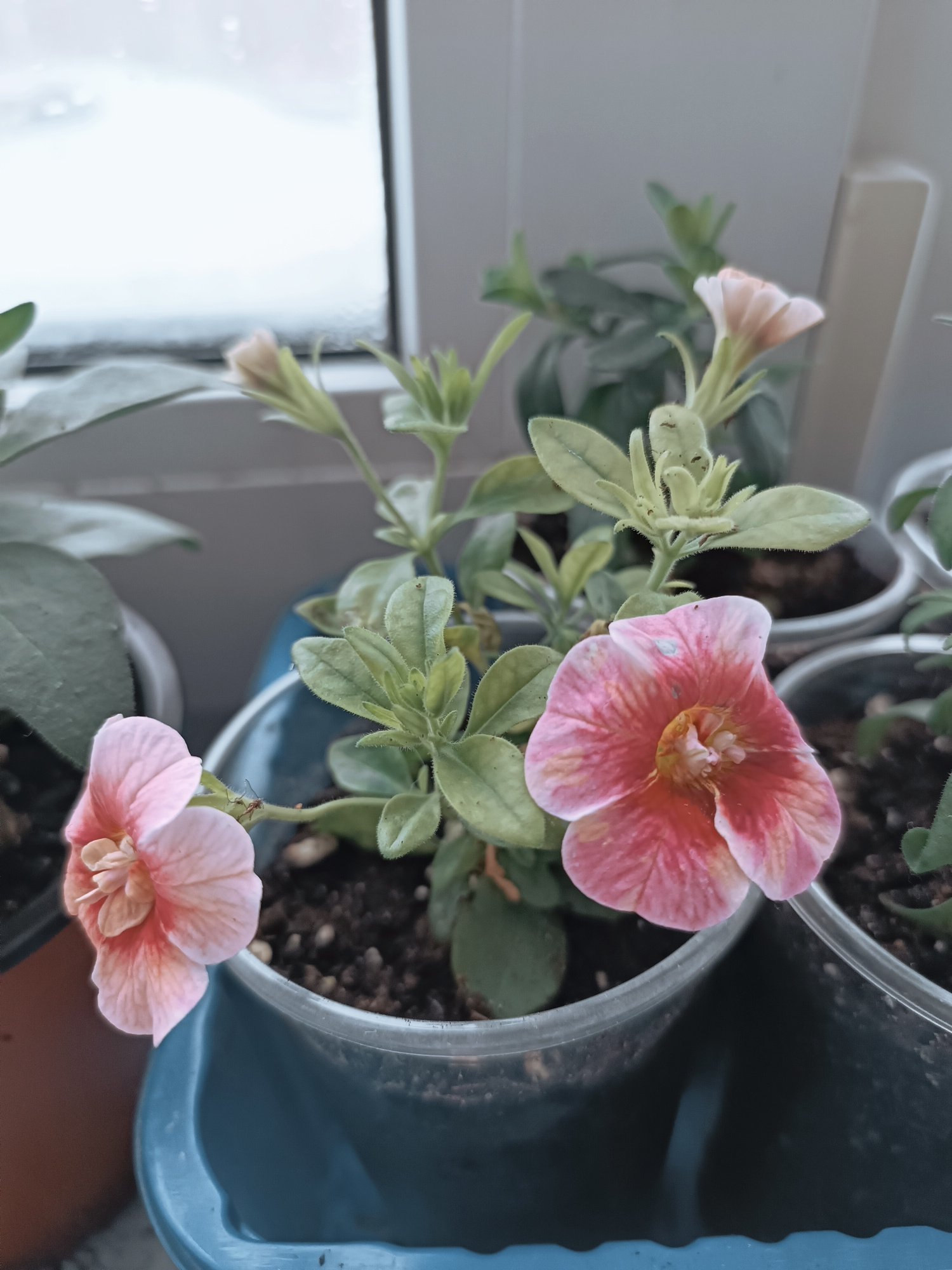 A close-up shot depicts a pink and orange Calibrachoa flower in a clear plastic pot, surrounded by other potted plants. The flowers are in full bloom, revealing intricate petal patterns and textures.…read more