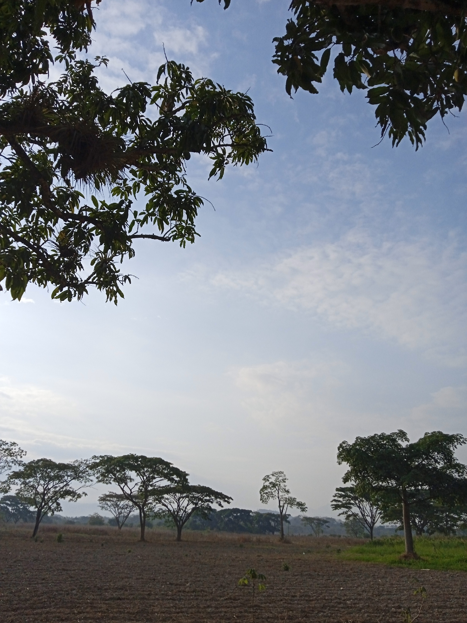 The image shows a cultivated field in Montalbán, Venezuela. The foreground consists of rows of tilled soil. Several trees with broad canopies are scattered across the field. In the background, a line…read more