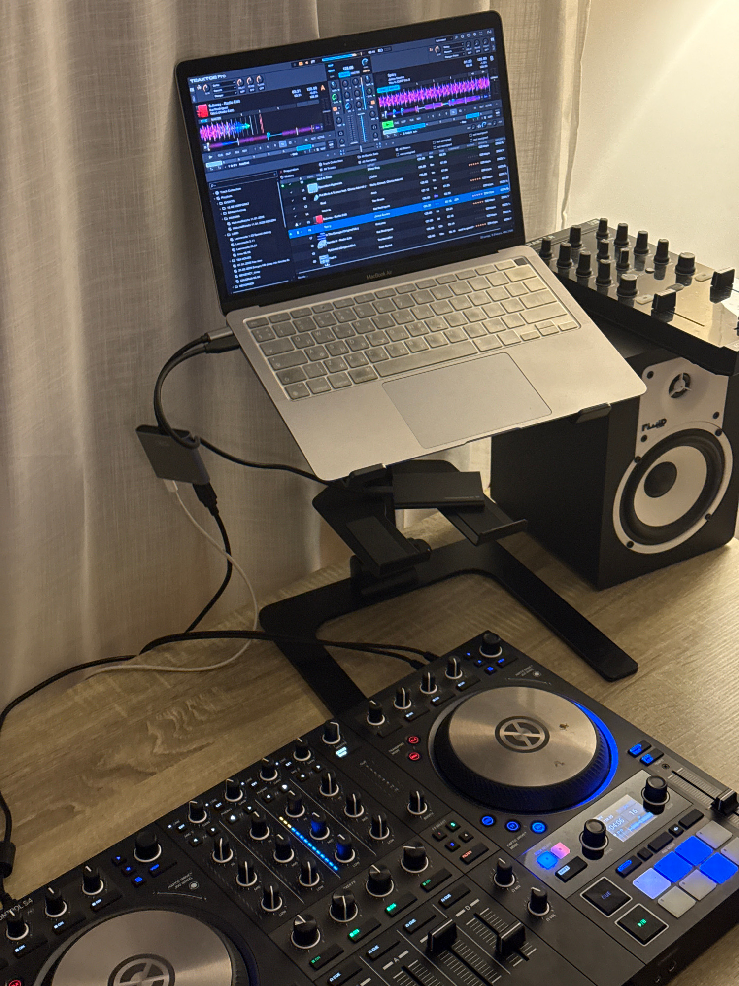The image shows a DJ setup consisting of a laptop, DJ controller, speaker, and other equipment. The laptop screen displays the Traktor Pro DJ software, and the DJ controller has various knobs, buttons…read more