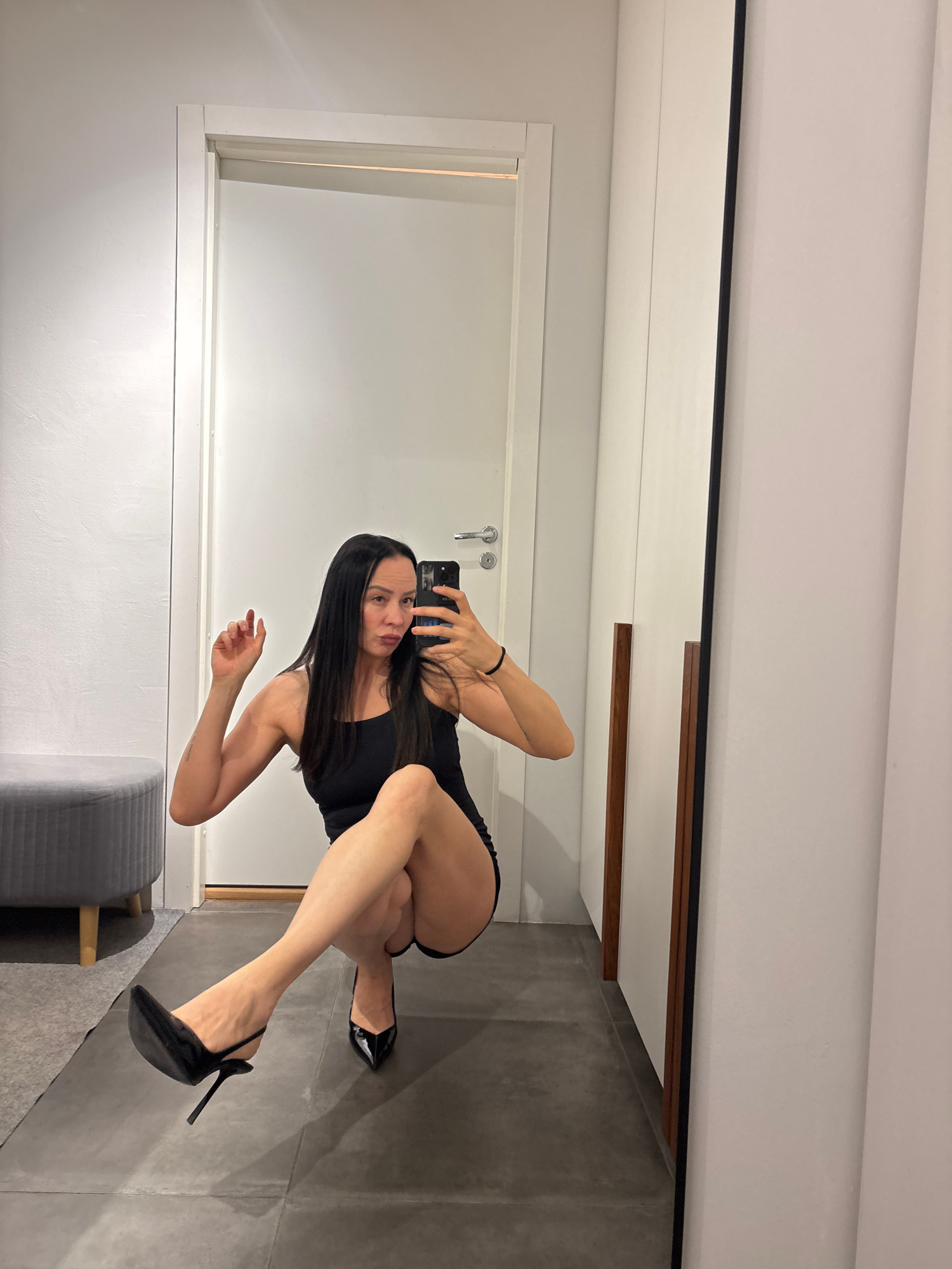 A woman is taking a mirror selfie indoors. She is wearing a black dress and black high heels. She is crouching in front of a mirror in what appears to be a fitting room. The room has white walls and g…read more