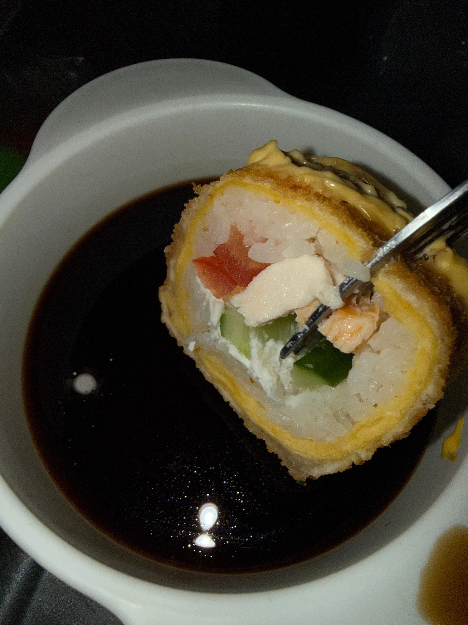 A partially consumed sushi roll, impaled by a silver fork, sits above a bowl filled with a dark liquid, possibly soy sauce. The sushi roll appears to be topped with a light-colored sauce. Inside, rice…read more