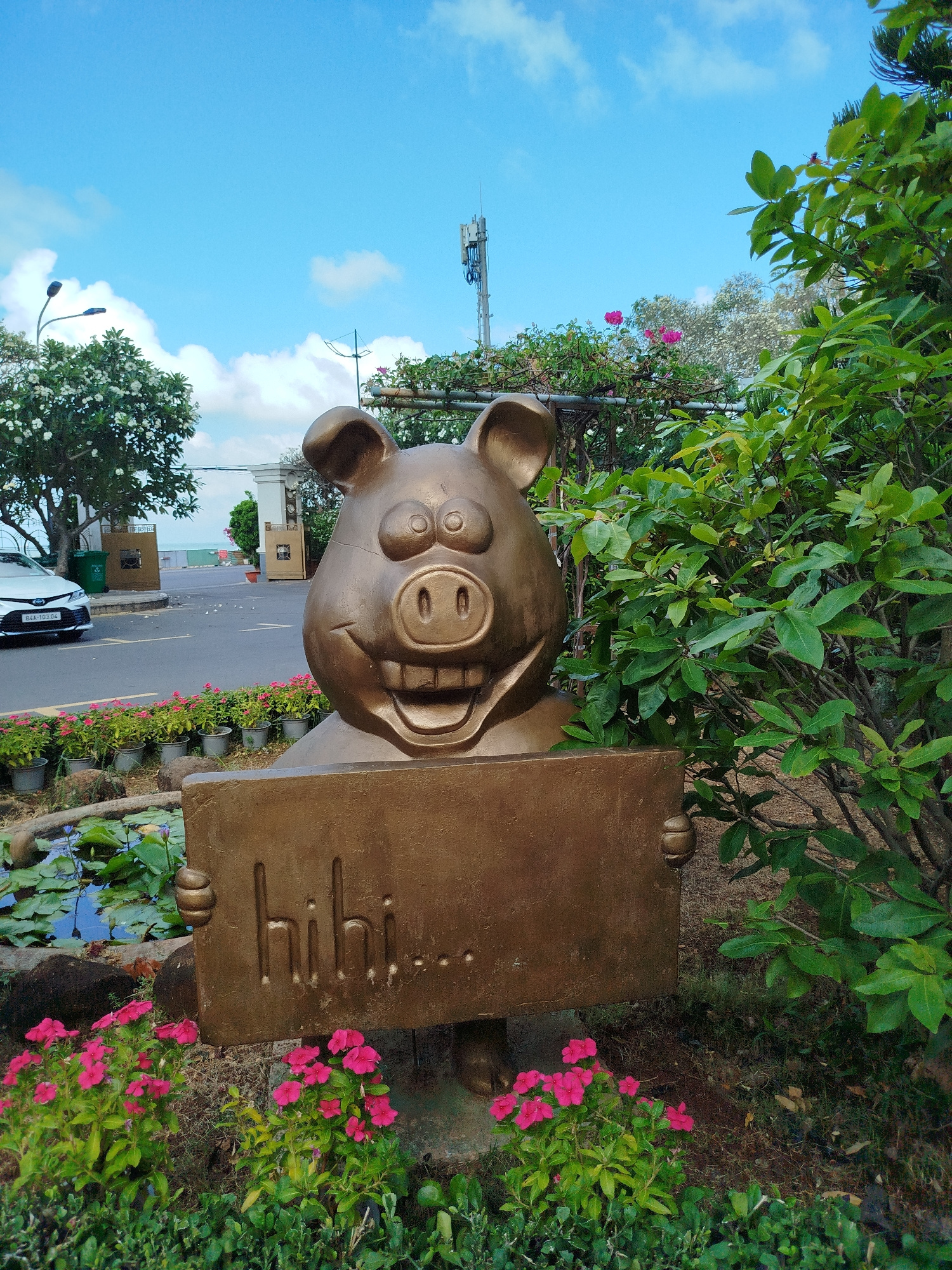 A full shot of a golden pig statue holding a sign that says "hihi" in an outdoor setting. The statue is surrounded by greenery, including shrubs and flowers, with a small pond visible in the foregroun…read more