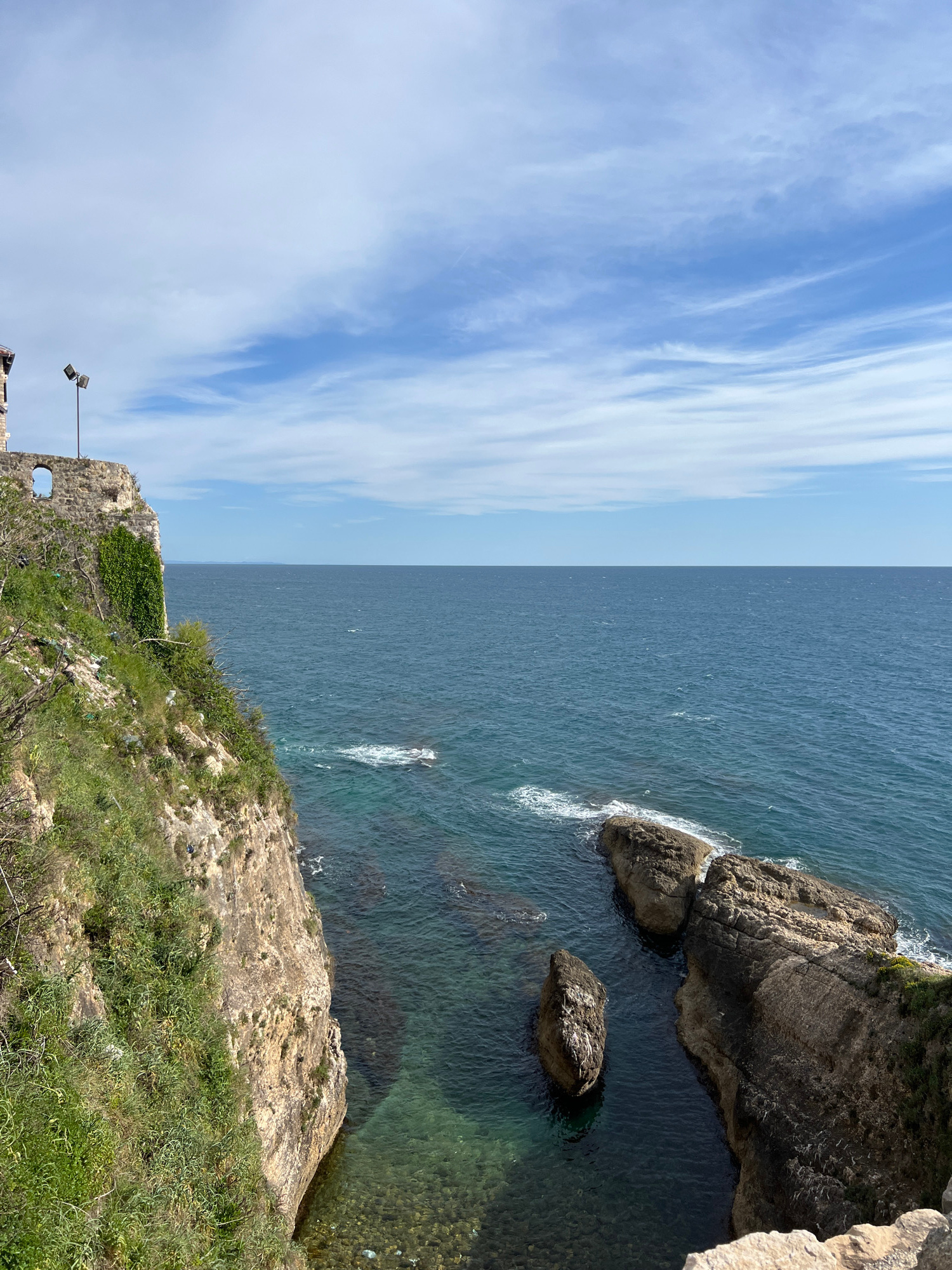 The image depicts a scene from Ulcinj, Montenegro, showing a cliff overlooking the Adriatic Sea. The sky is partly cloudy with streaks of clouds. Below, the sea extends to the horizon, meeting the sky…read more