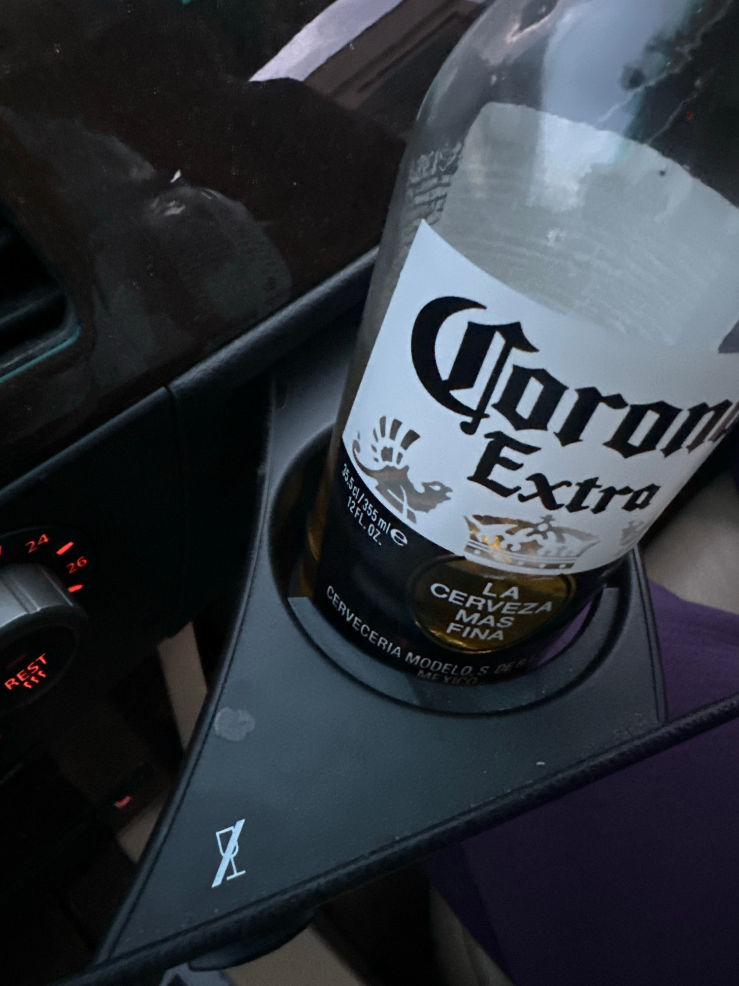 The image shows a partially consumed bottle of Corona Extra beer placed in a black plastic cupholder, likely inside a car, given the dashboard details visible in the lower portion of the frame. The bo…read more