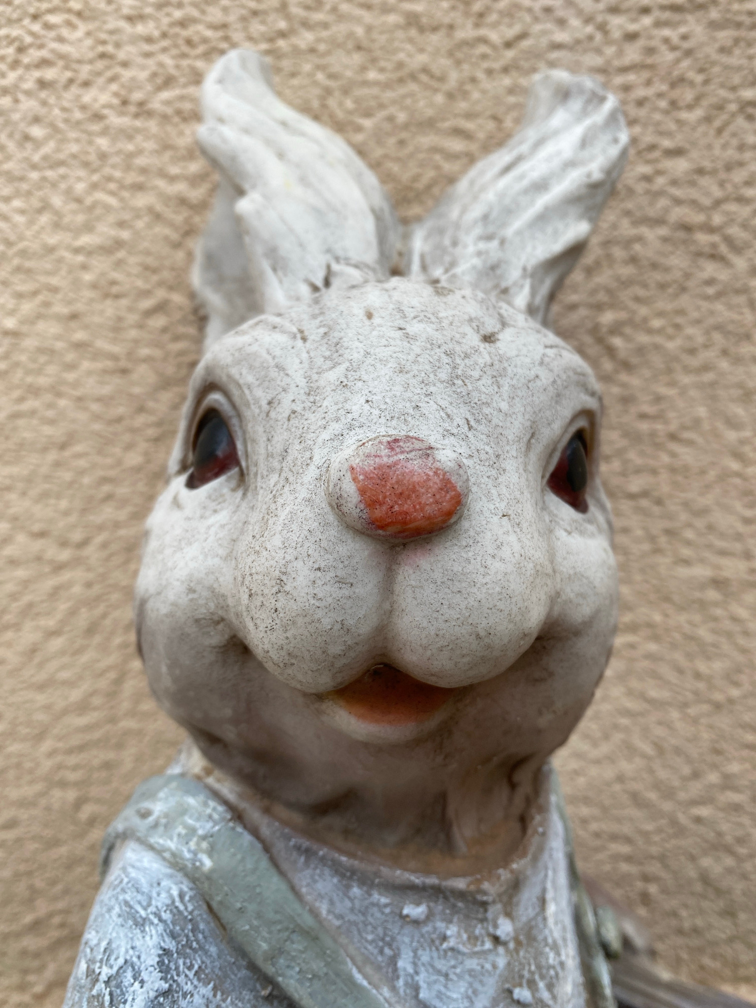 A weathered white rabbit statue is depicted in a close-up, head-on view against a textured, light brown stucco wall. The statue features dark, circular eyes, an orange-red nose, and a slightly open mo…read more