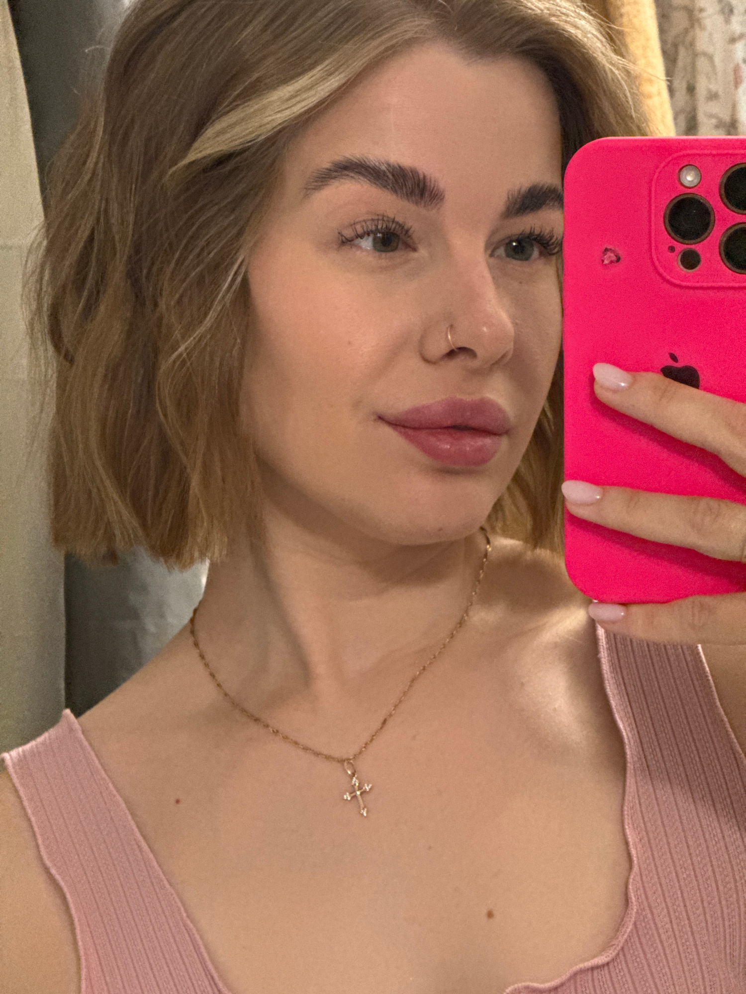 A woman with light brown hair and fair skin is holding a pink mobile phone up to her face in a selfie. She is wearing a light pink top and a delicate gold necklace with a cross pendant. A small gold hβ¦read more