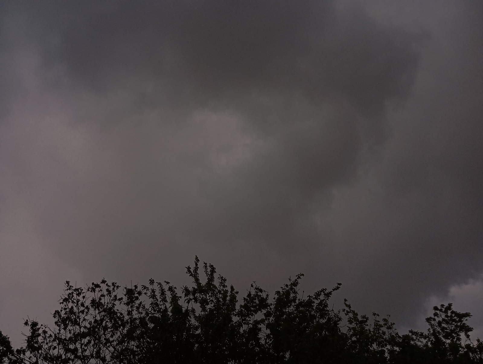 The image presents a dark, overcast sky above silhouetted trees. The heavy cloud cover indicates a possible storm or recent rainfall. No identifiable people or specific objects are visible in the imag…read more