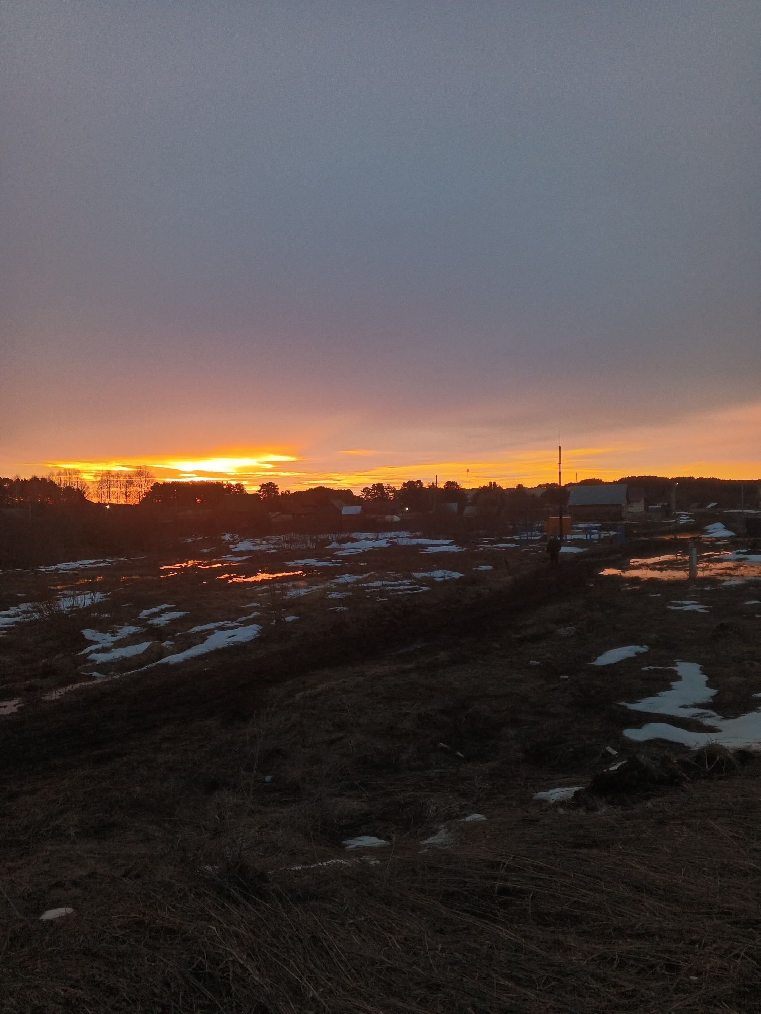 The image depicts a landscape at sunset in what appears to be the rural area of Rusalevka, Russia. The sky is filled with hues of orange and purple, typical of a sunset. The horizon is silhouetted wit…read more
