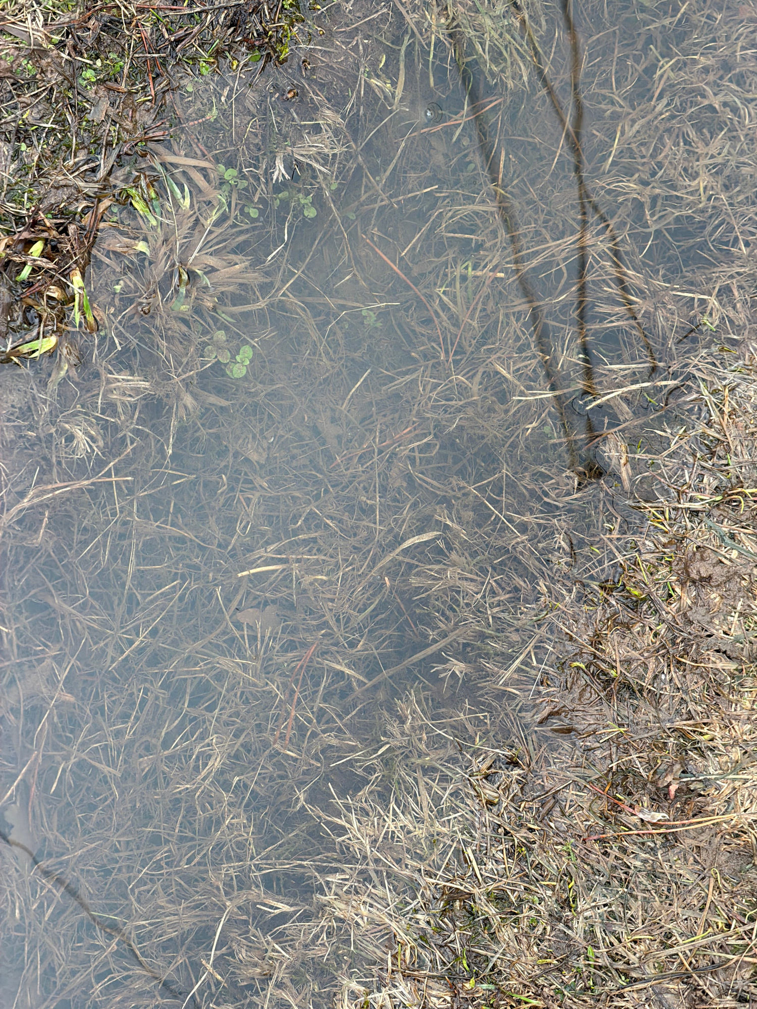 The image shows a stagnant puddle of water with submerged dead grass and debris. The edges of the puddle are lined with more dead grass and some sparse, emerging green vegetation. The water is murky a…read more
