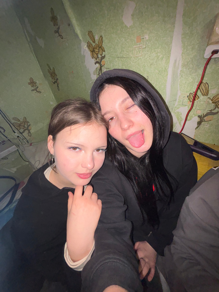 Two young females are depicted in a close-up selfie-style image, taken indoors in the city of Фоки, Russia. The female on the left has light brown hair, wears a dark long-sleeved top over a lighter-co…read more