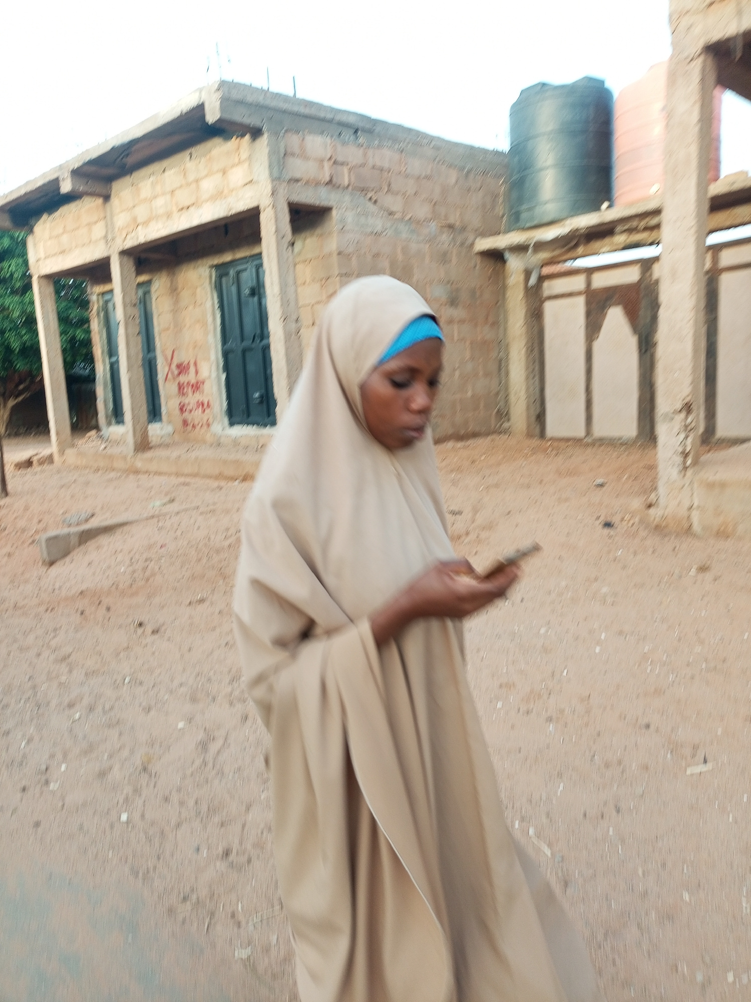 A woman in a tan hijab and blue headband is standing on a dirt road, looking at a cell phone in her hands. In the background is a partially constructed building with dark doors and what appears to be…read more