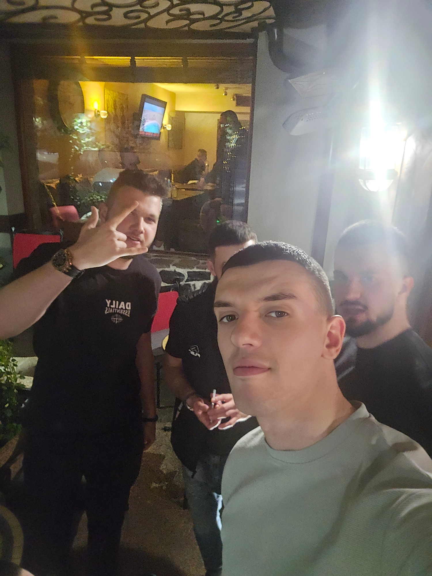 A sideways shot depicts four young men in an indoor setting. The man in the foreground, wearing a black t-shirt with the text "DAILY ESSENTIALS," is flashing a hand gesture. Another man, with a close-…read more