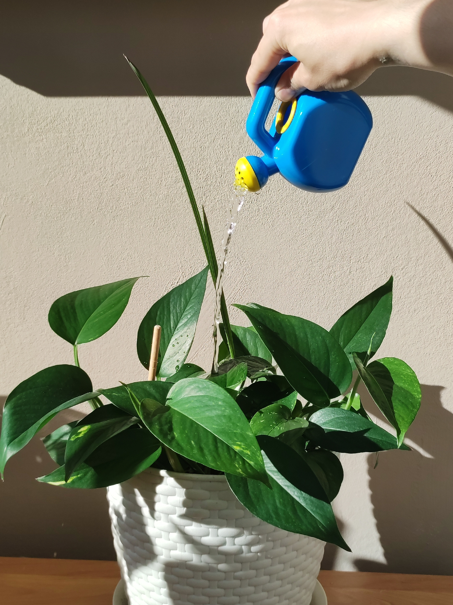A pothos plant in a white basket-weave pot is being watered by a hand holding a small blue and yellow plastic watering can. The plant has multiple broad, green leaves. A single, tall, thin green leaf…read more