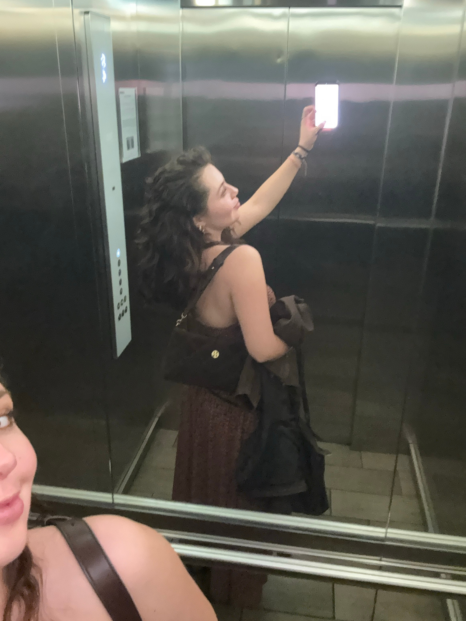 A woman is taking a selfie in an elevator. She is holding up her phone with her right hand. She has curly dark hair and is wearing a dark top with a cross-body bag. The elevator is lined with stainles…read more
