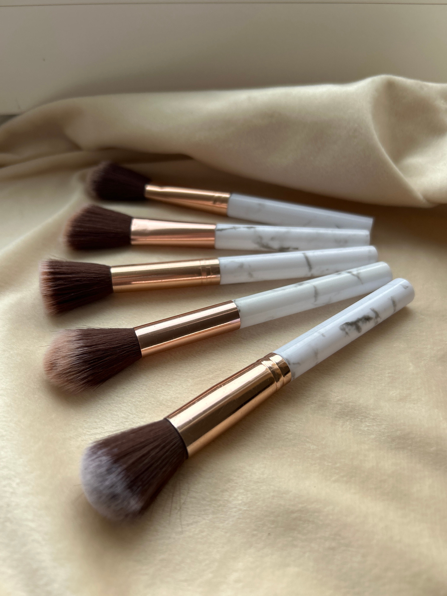 Five makeup brushes are arranged on a light beige, textured surface, possibly fabric. The brushes have white marble-patterned handles and rose gold-colored ferrules. The brush heads vary in size and s…read more